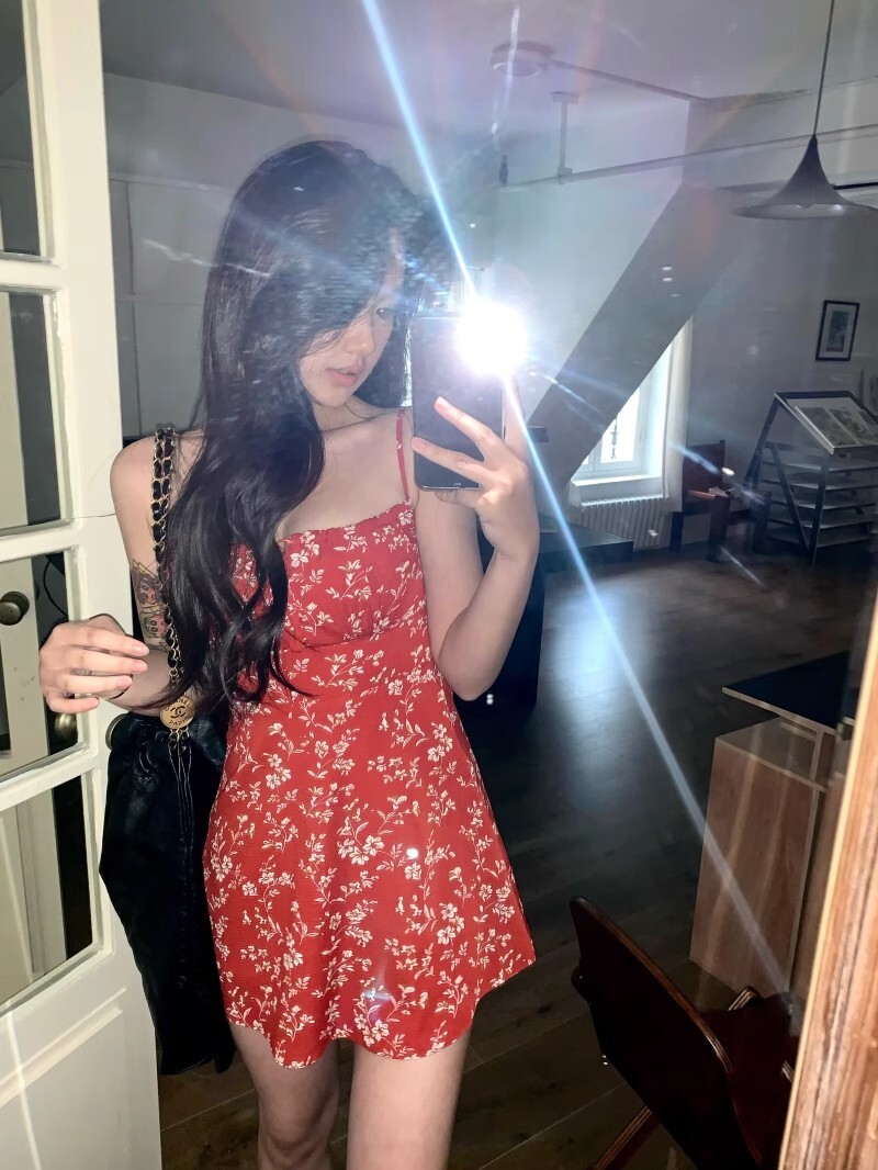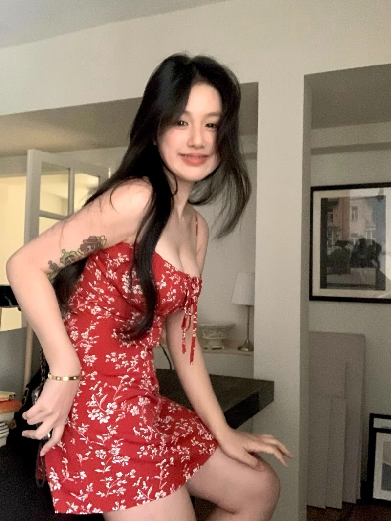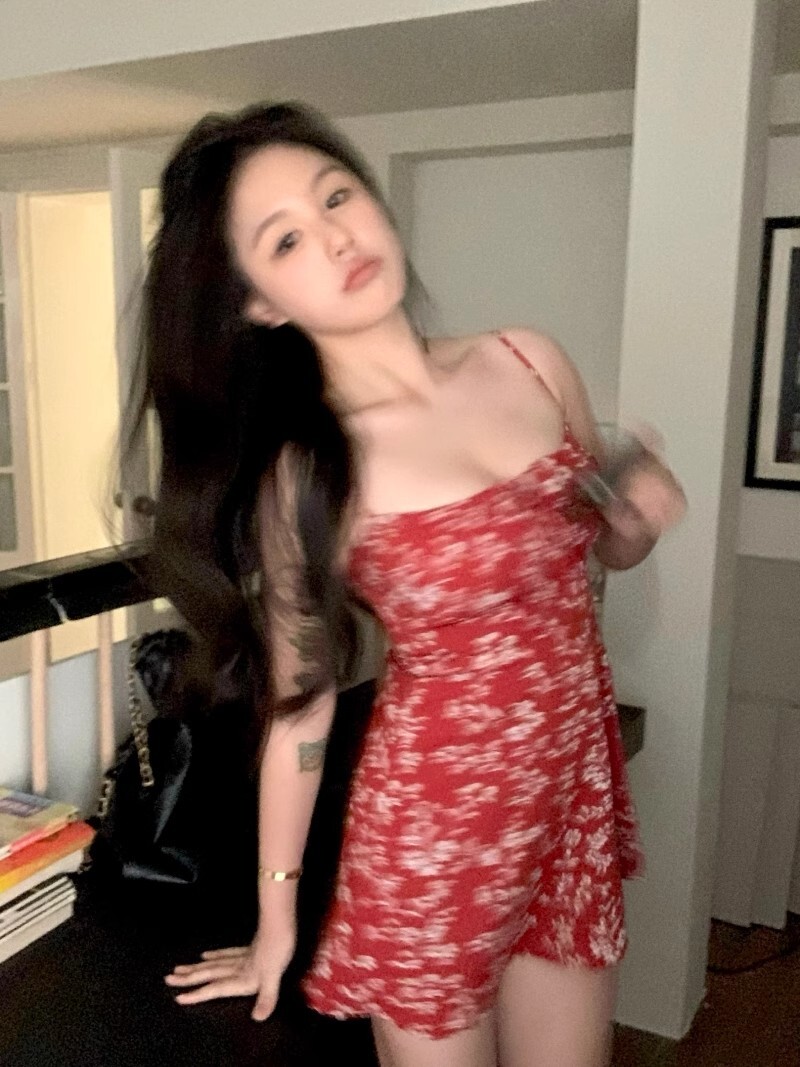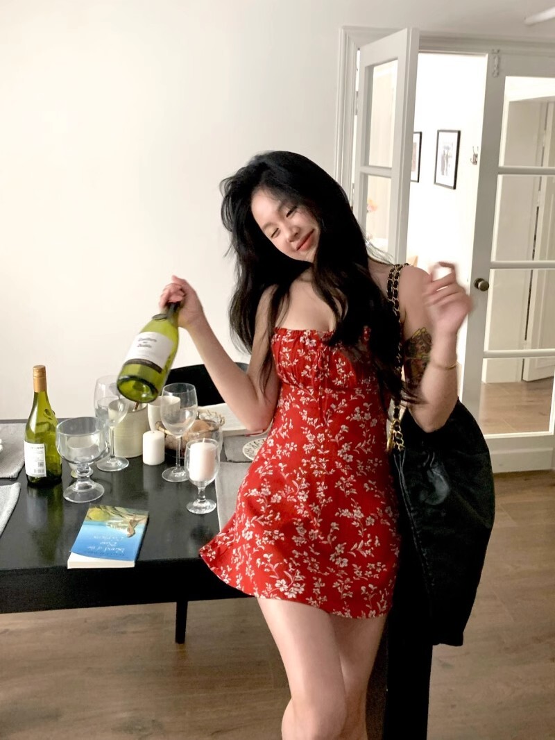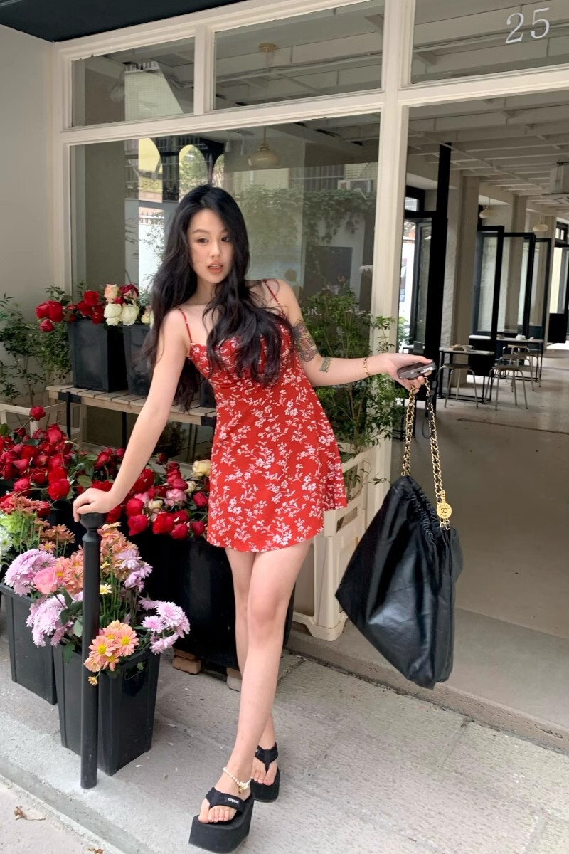 • 红色碎花吊带裙女春季2024新款度假风性感收腰显瘦A字连连衣