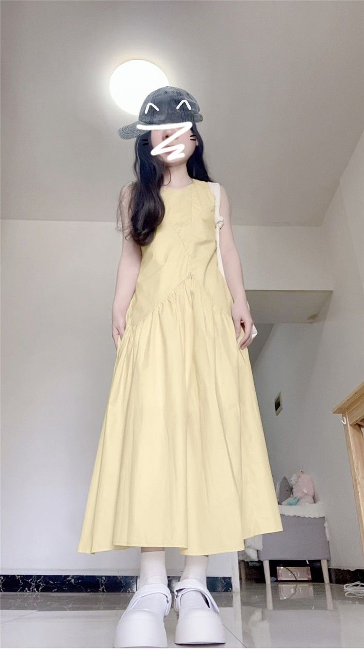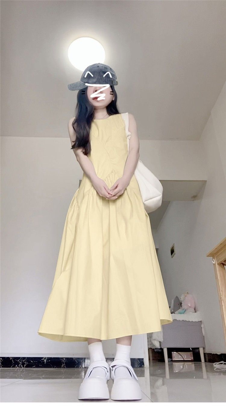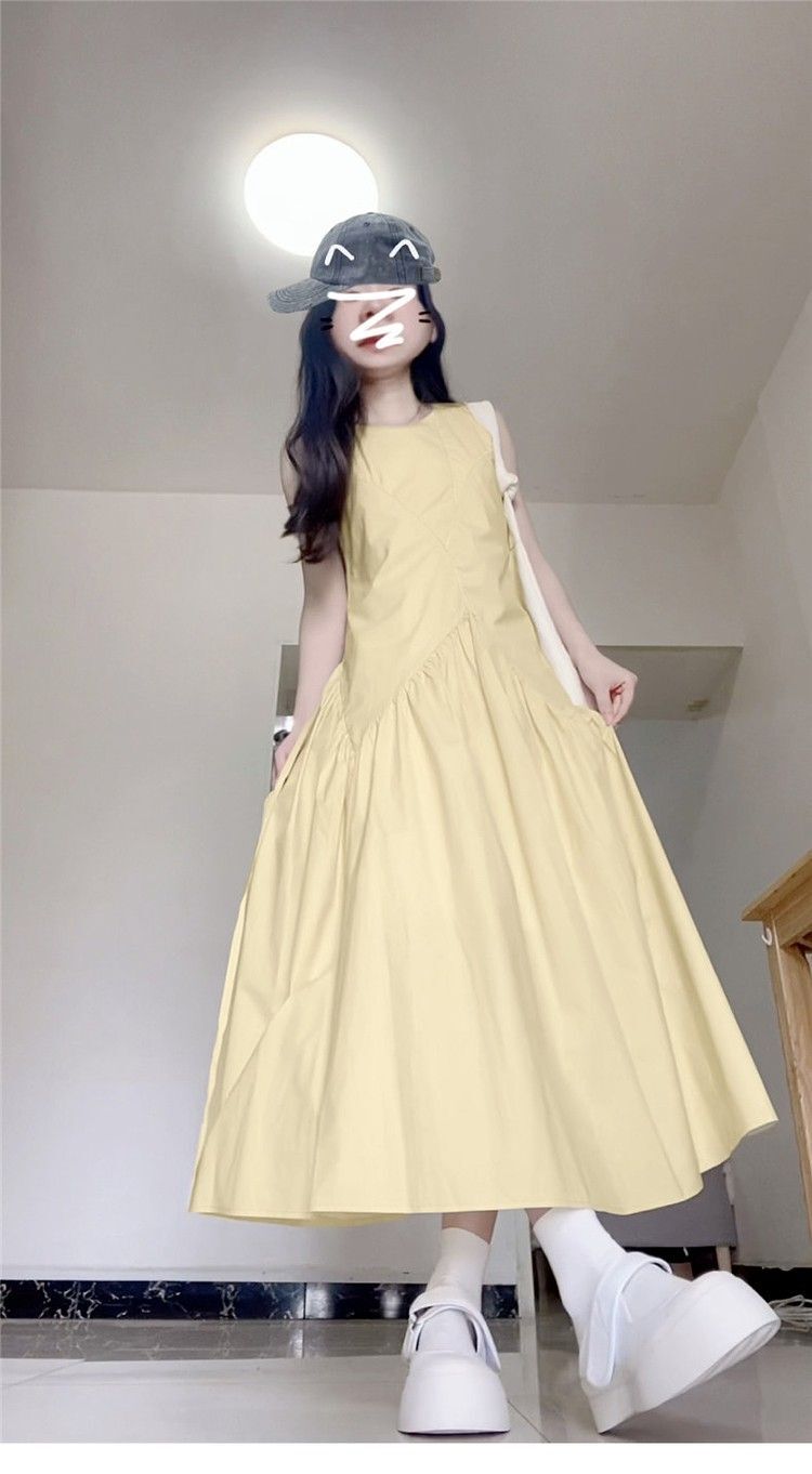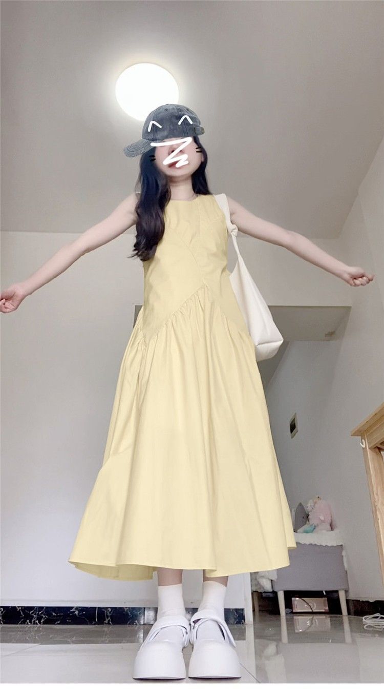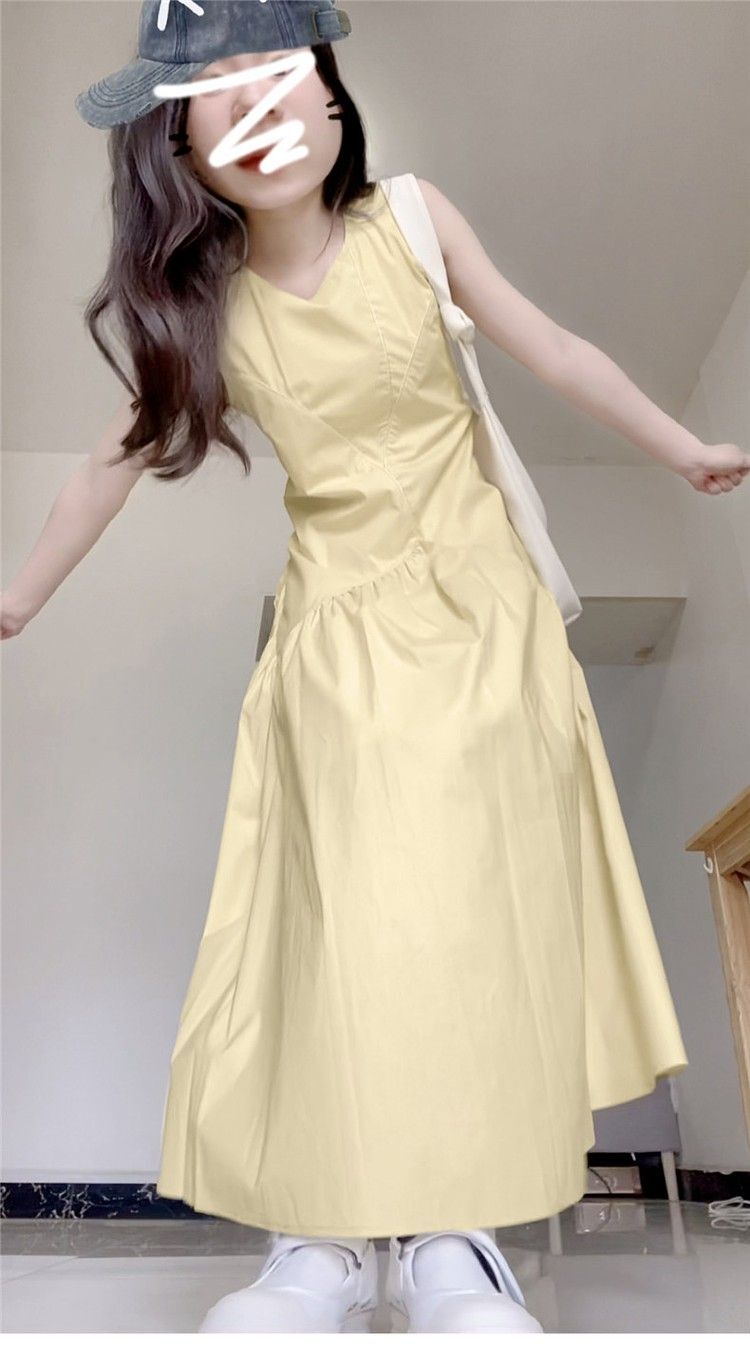 • 法式气质无袖背心连衣裙淡黄色女装夏季多巴胺甜美减龄a字长裙子