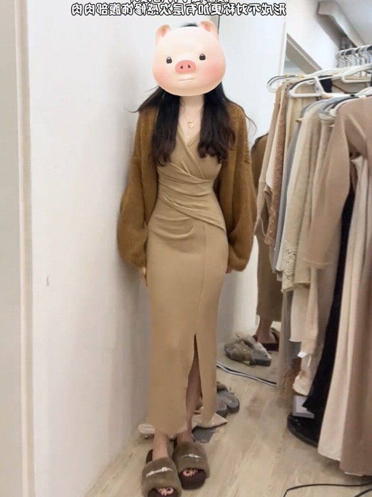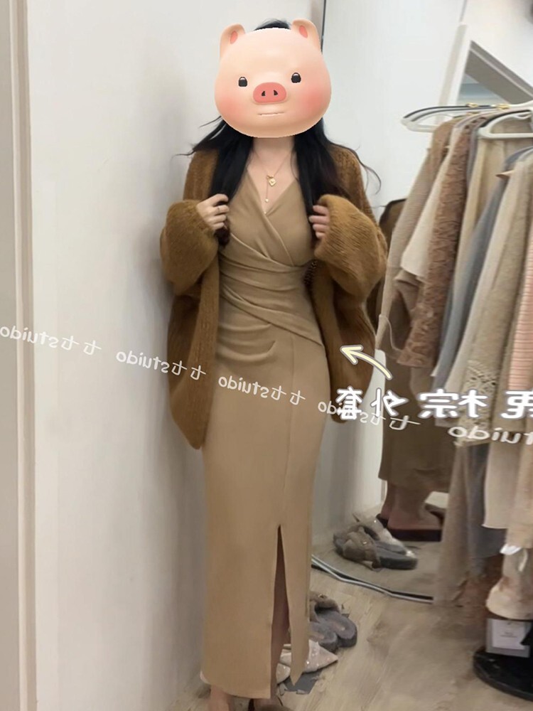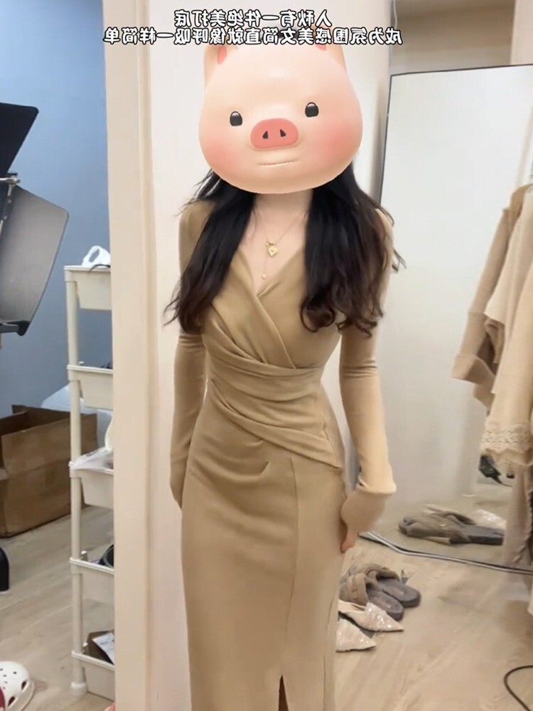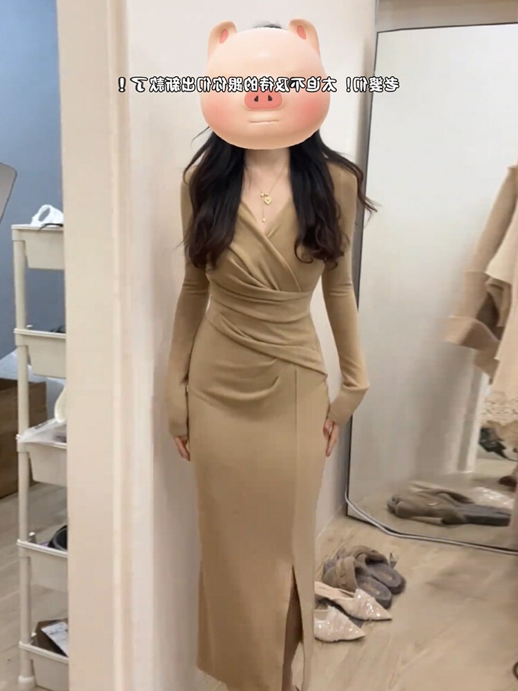 • 性感交叉V领褶皱连衣裙女装冬季2024新款气质百搭收腰显瘦包