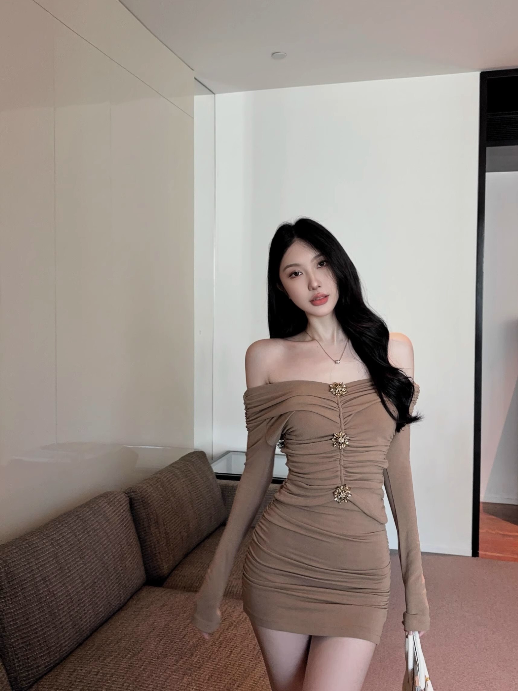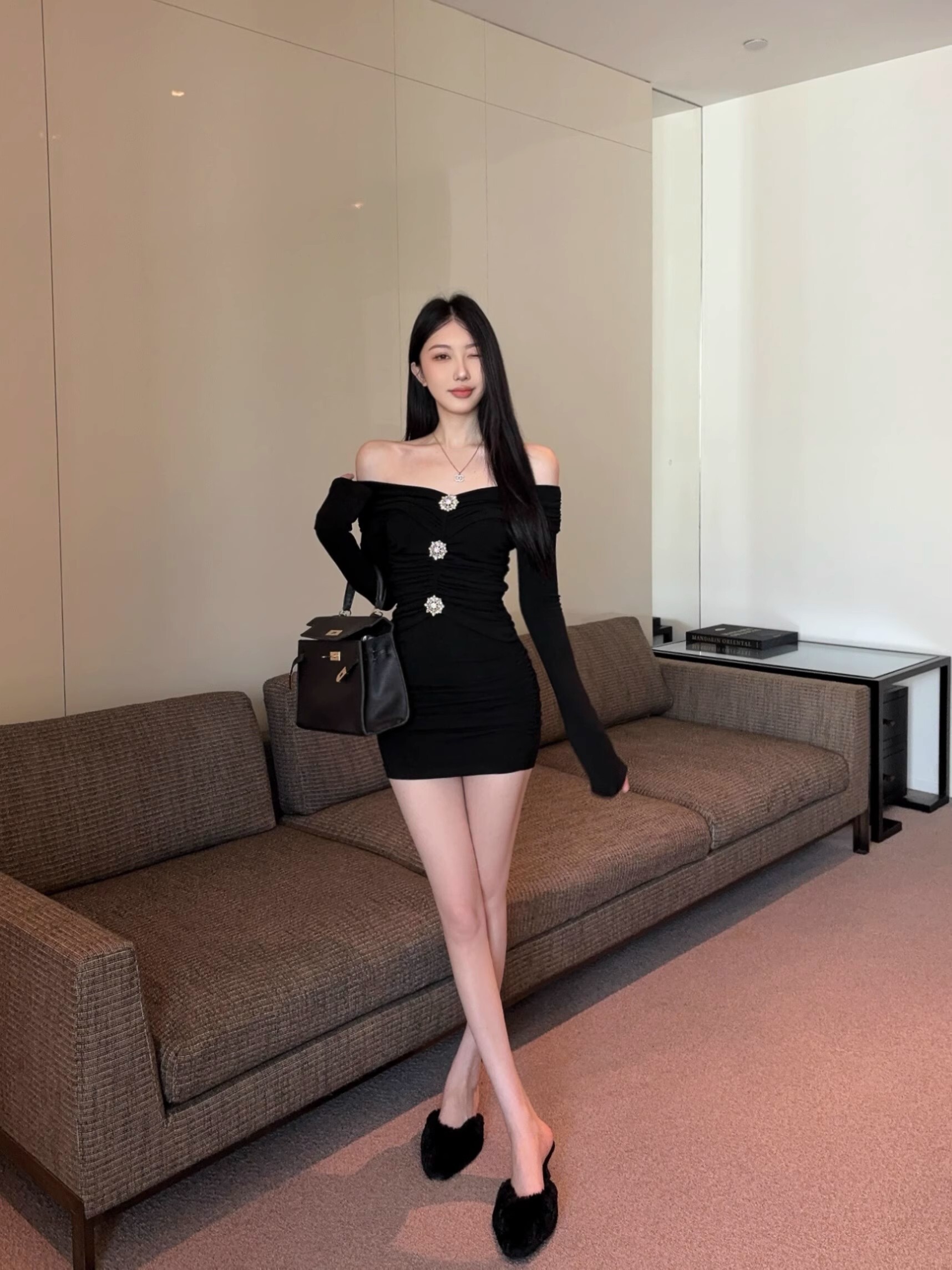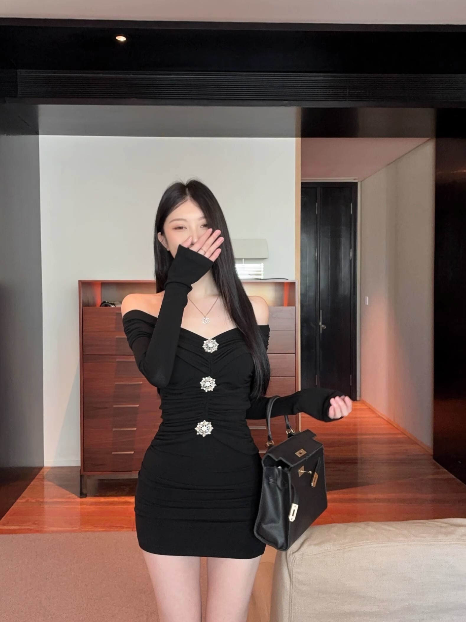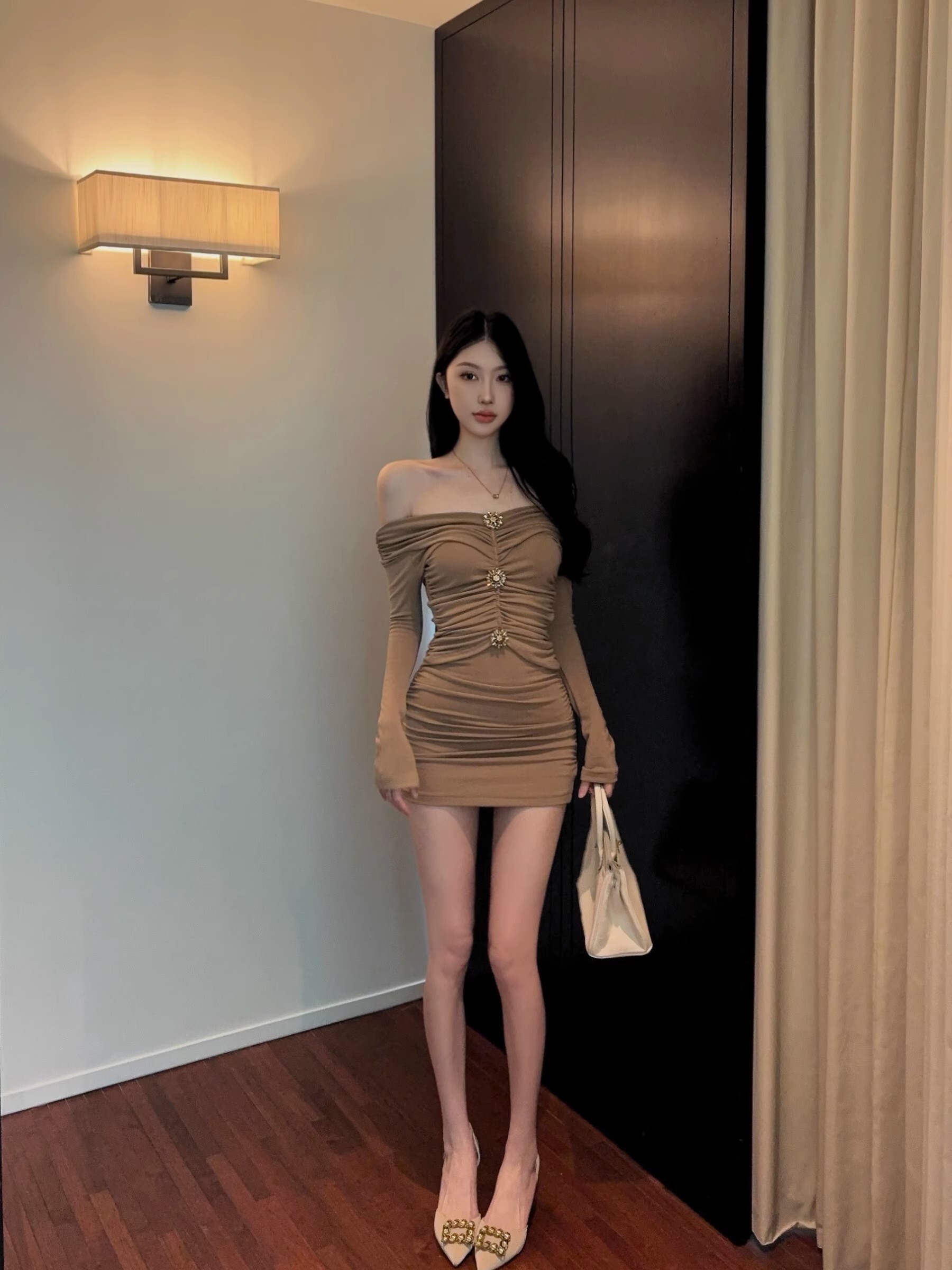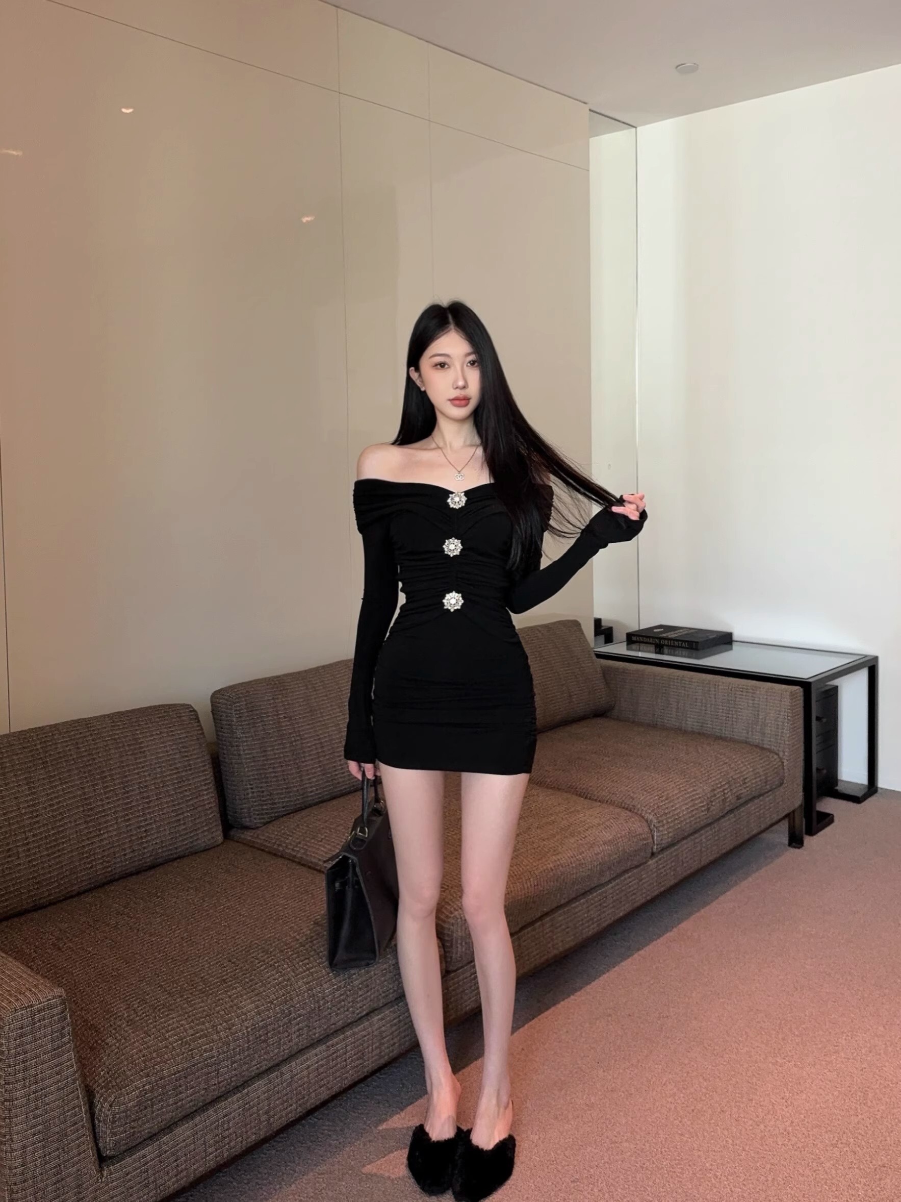• 修身显瘦氛围感一字肩褶皱长袖包臀连衣裙秋冬气质纯欲约会短裙女