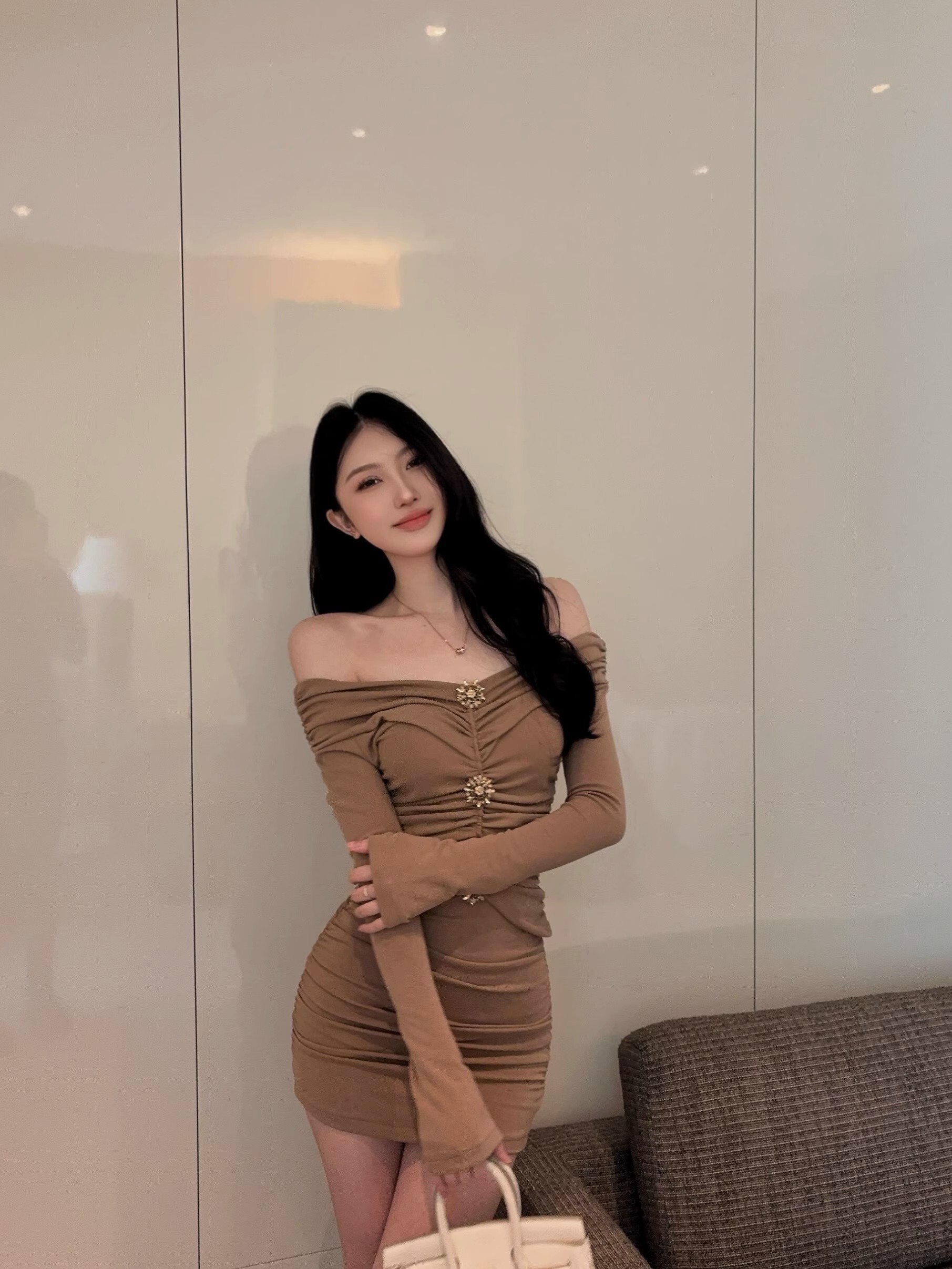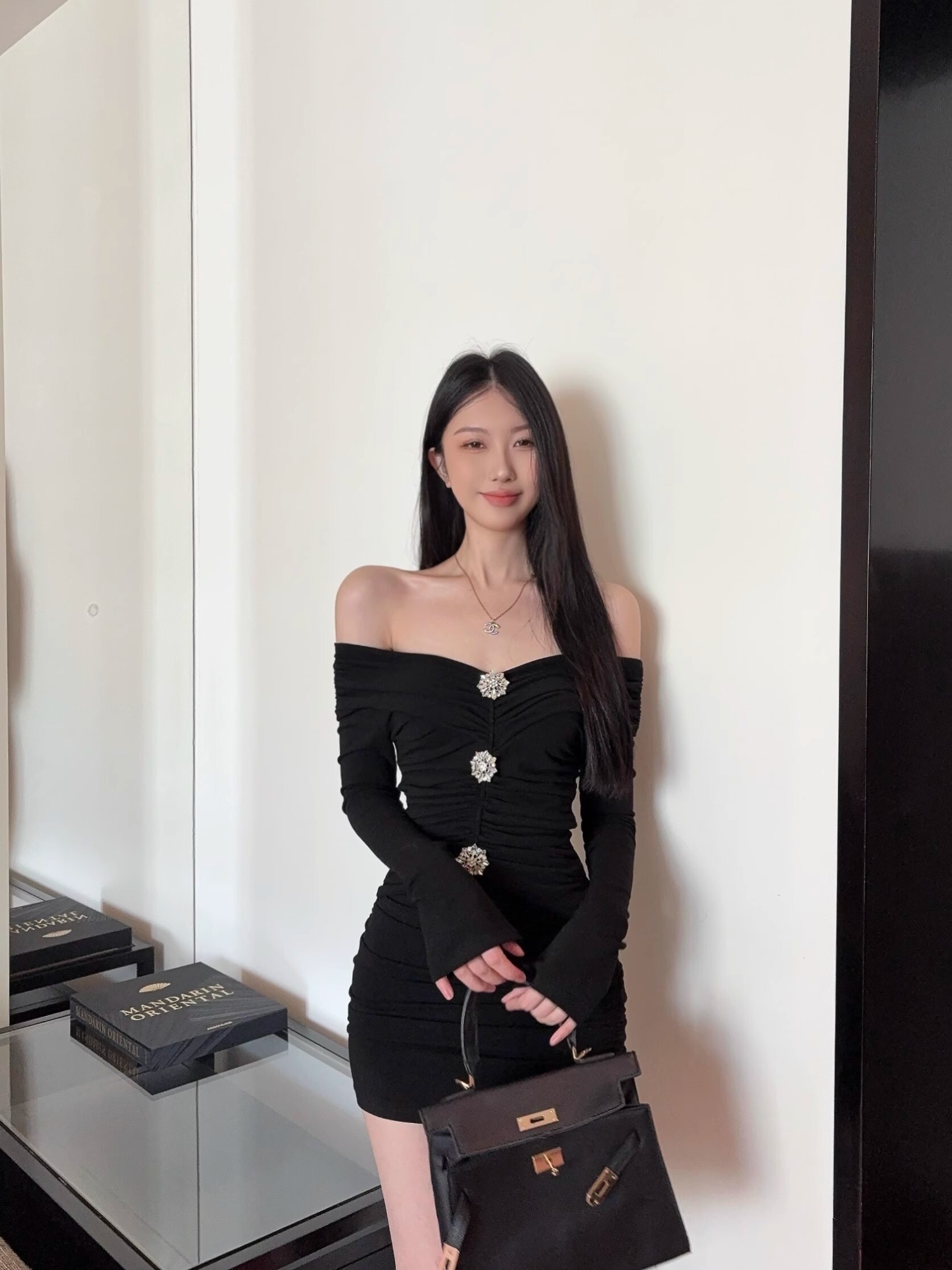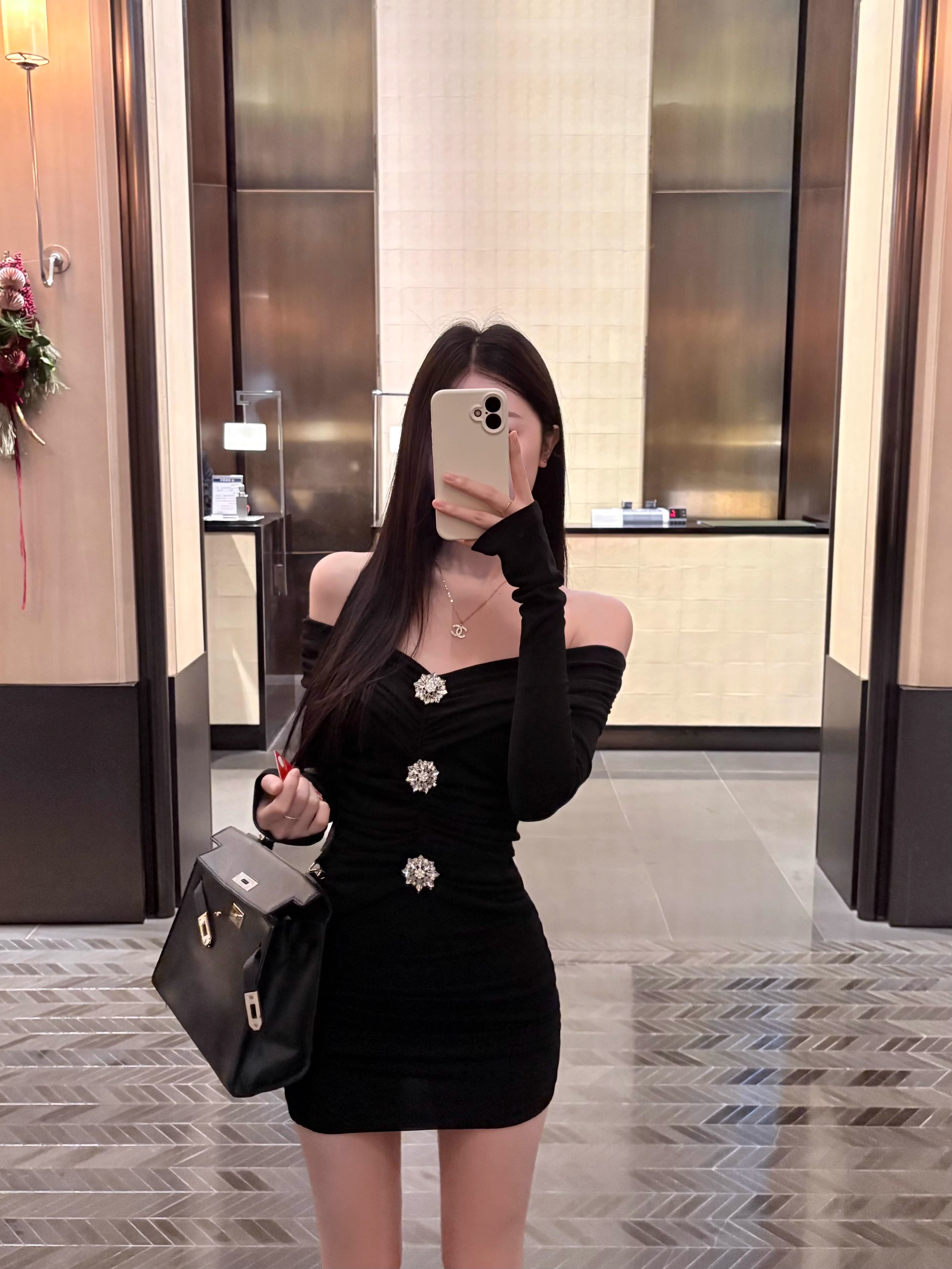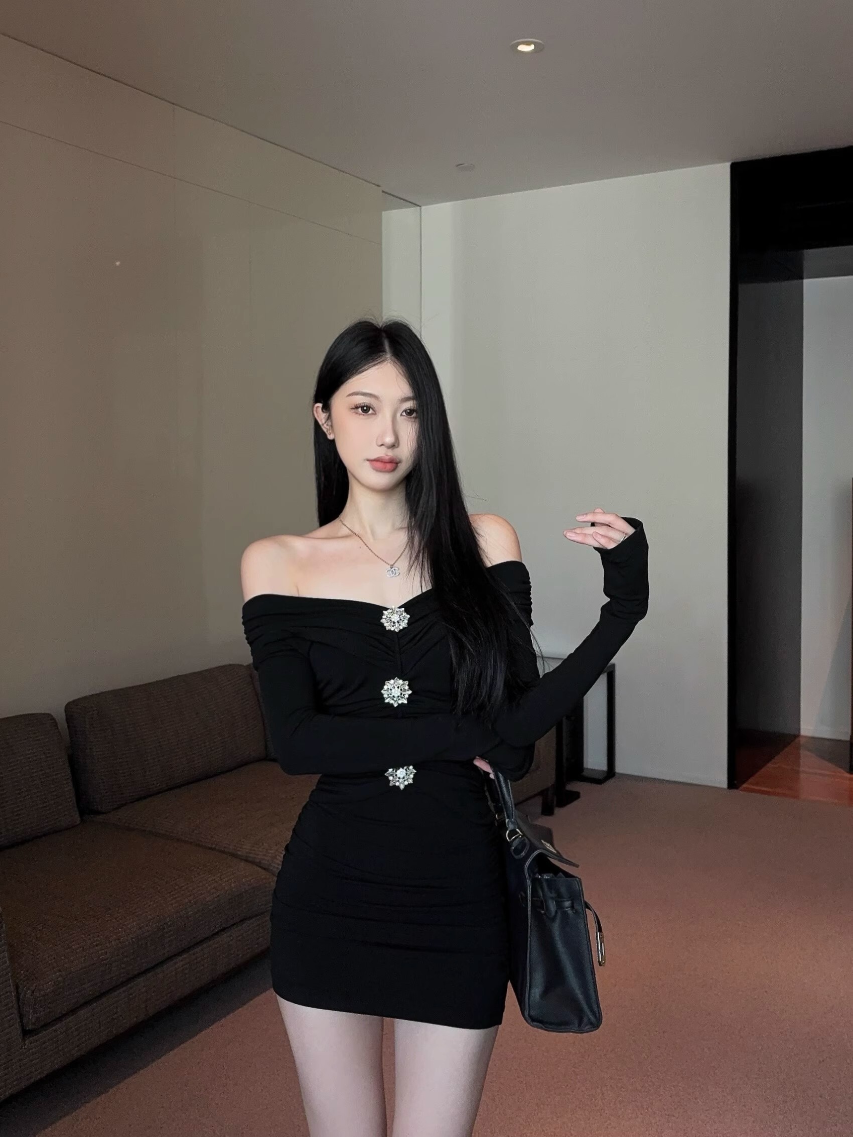 • 修身显瘦氛围感一字肩褶皱长袖包臀连衣裙秋冬气质纯欲约会短裙女