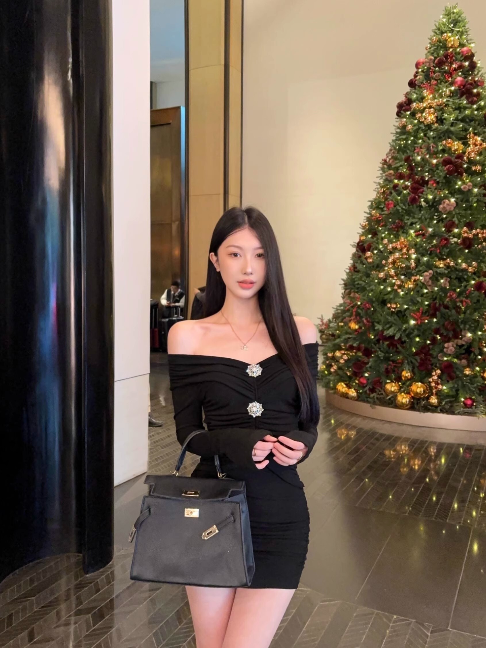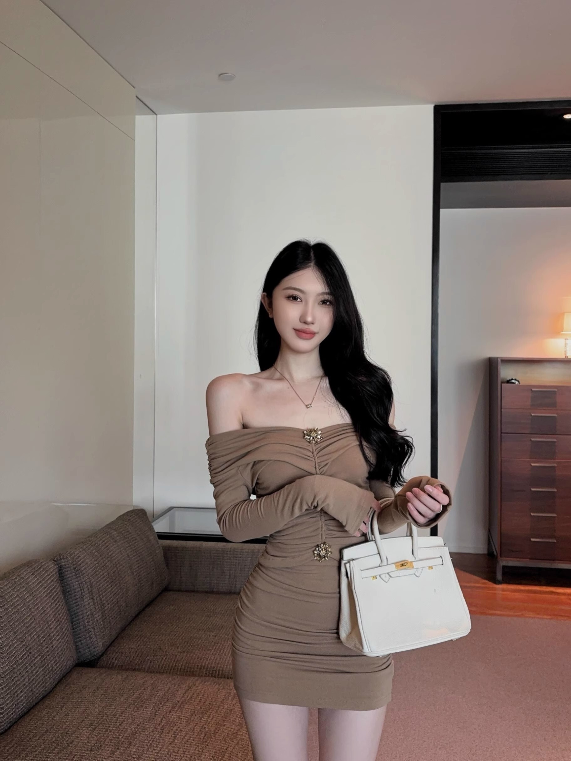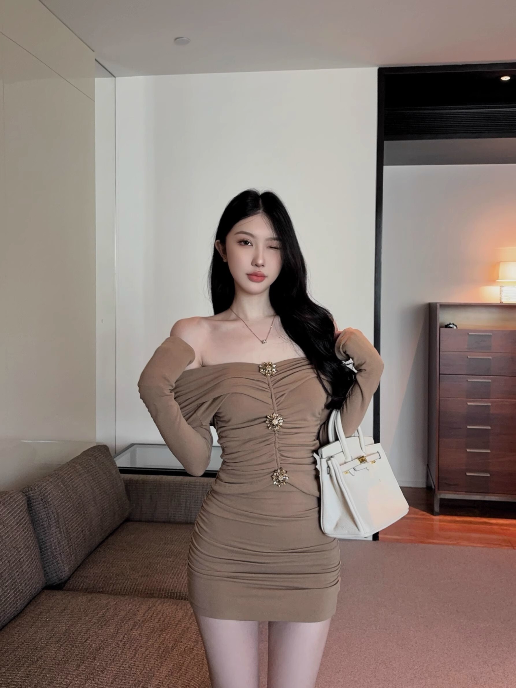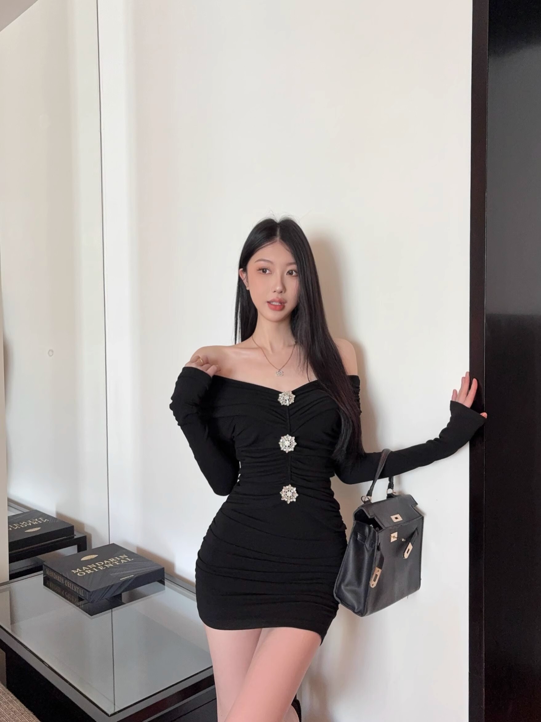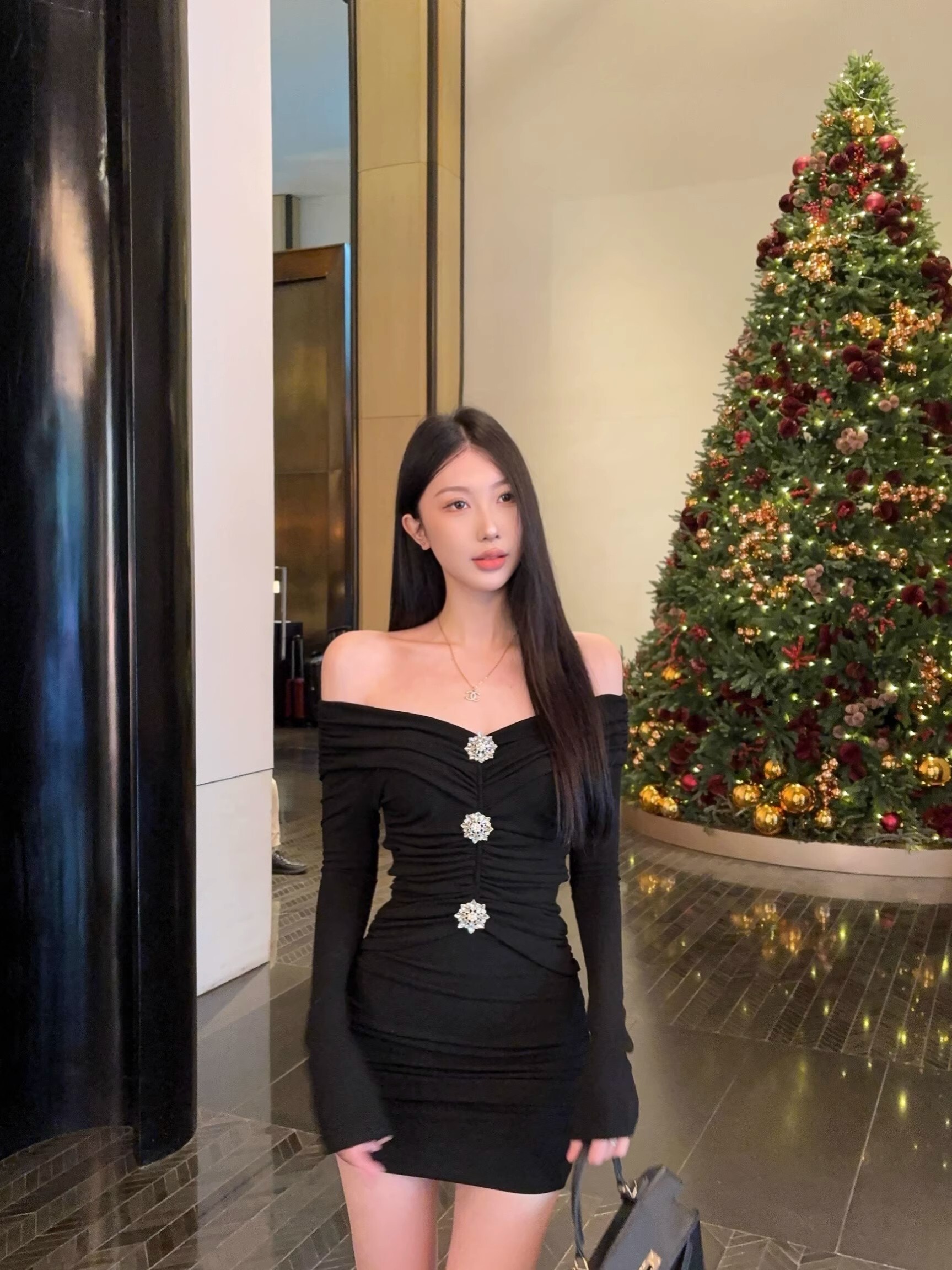 • 修身显瘦氛围感一字肩褶皱长袖包臀连衣裙秋冬气质纯欲约会短裙女