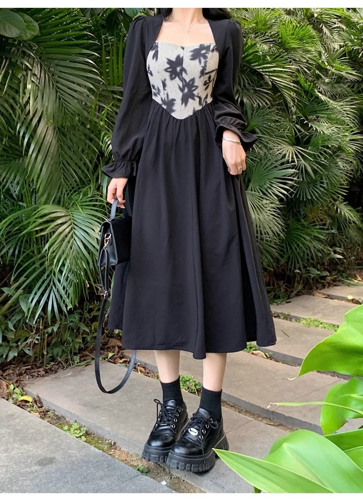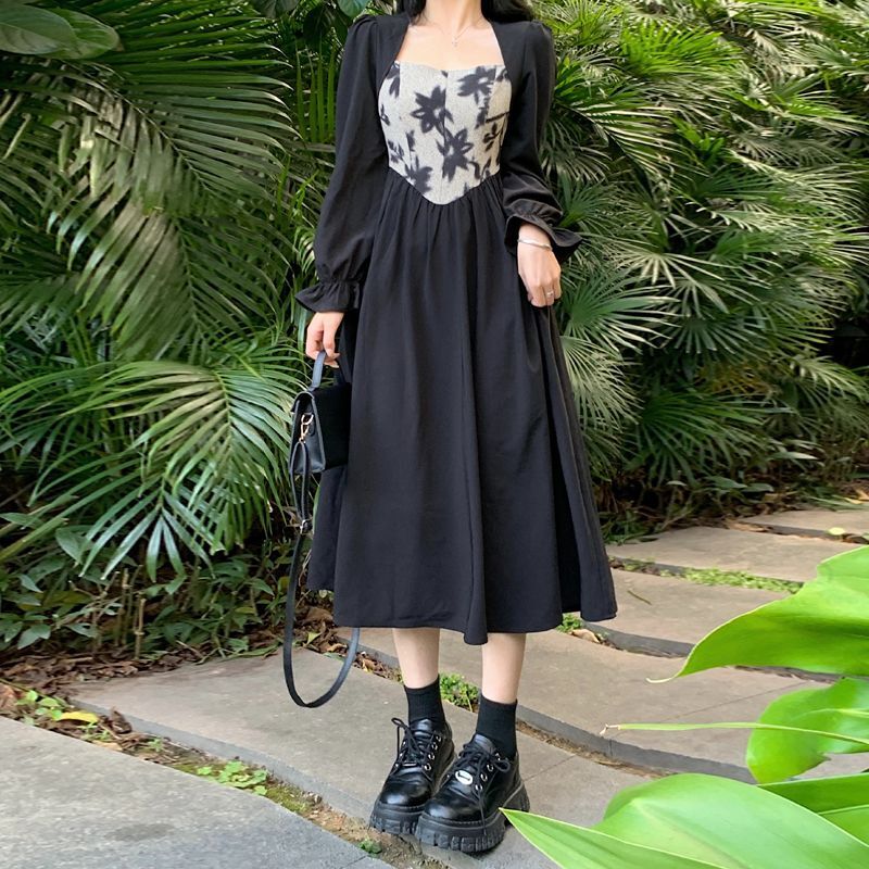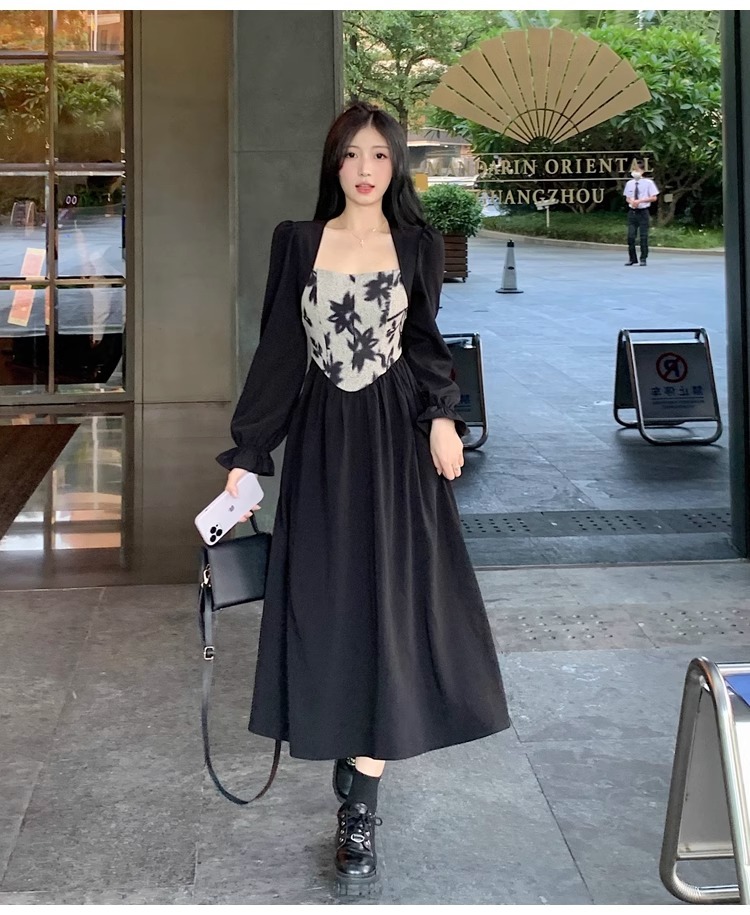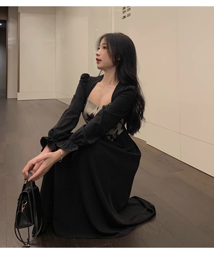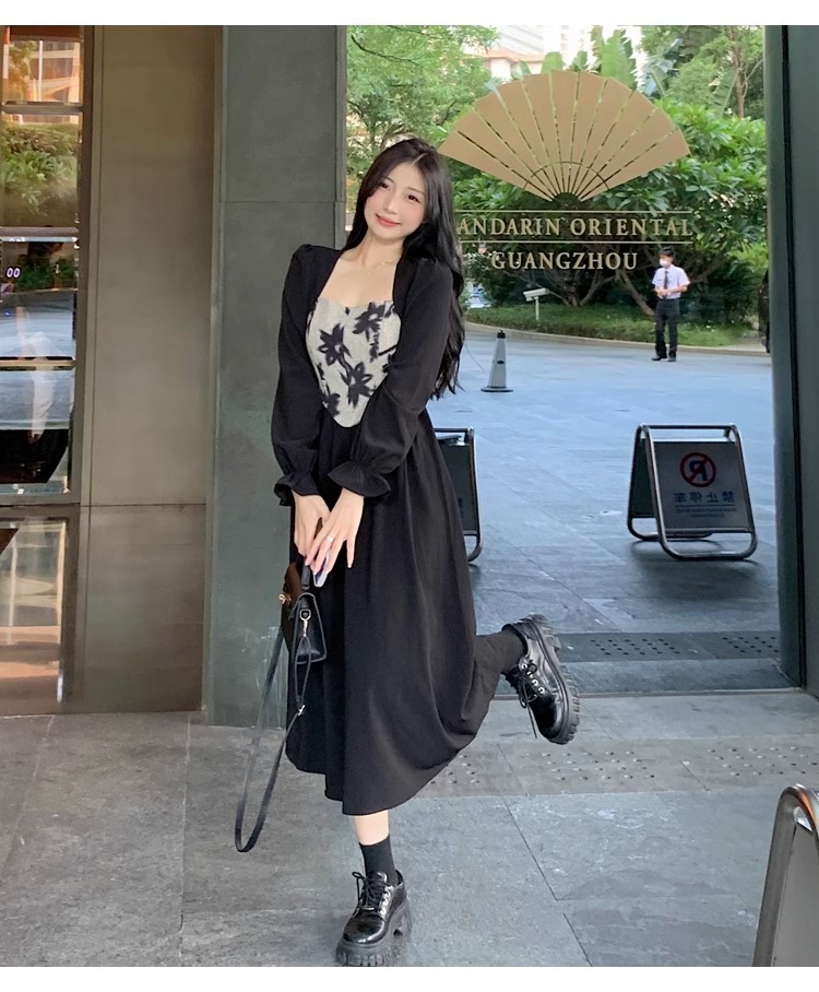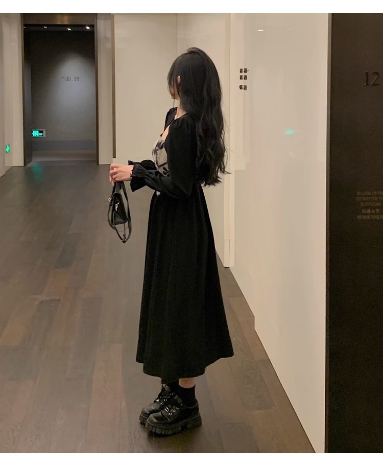 • 大码胖MM法式赫本风黑色方领连衣裙女秋季高级感拼接收腰显瘦裙