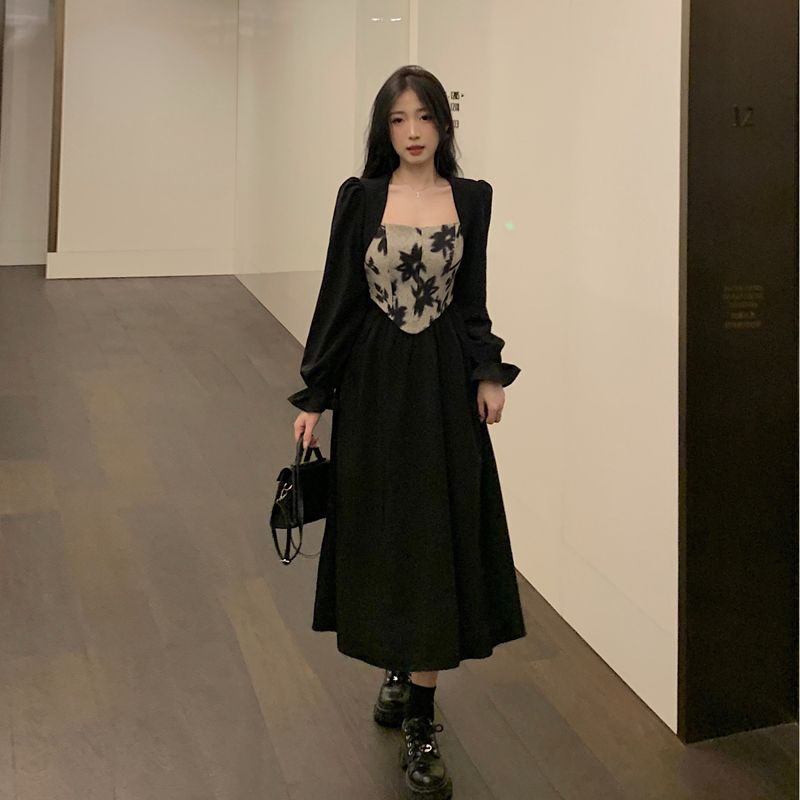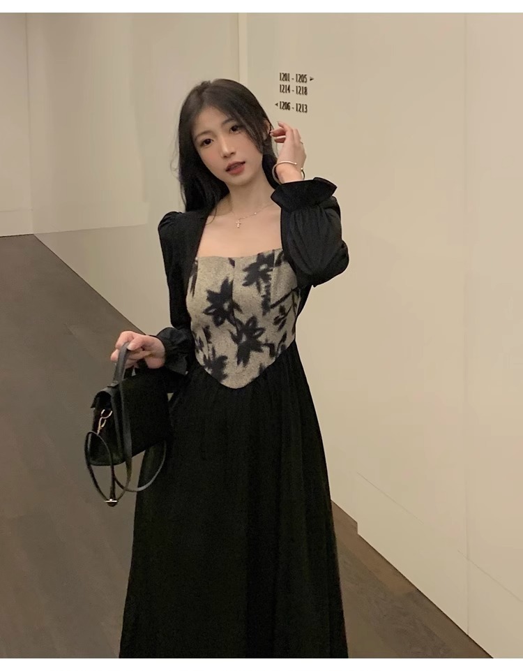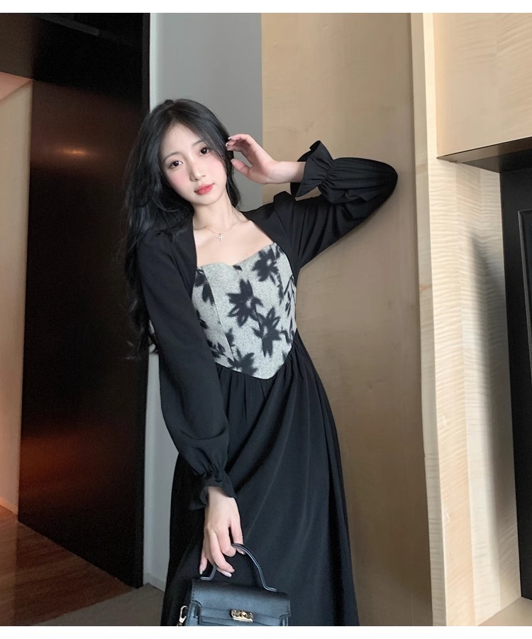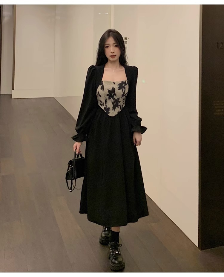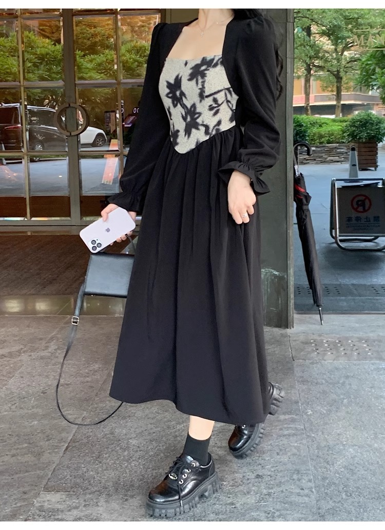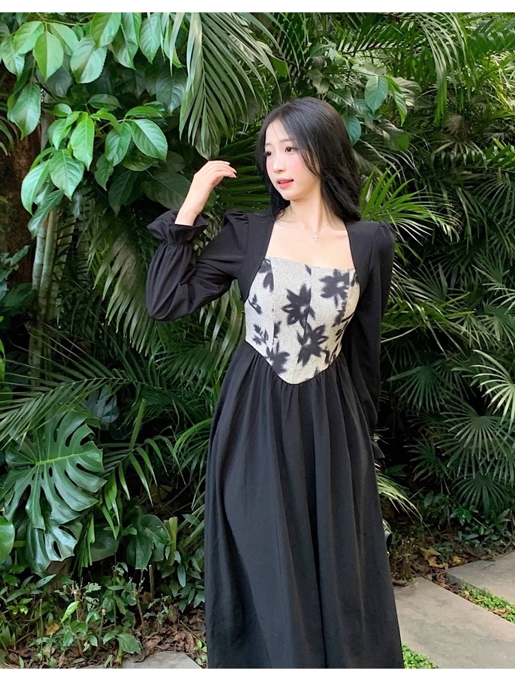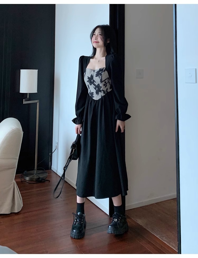 • 大码胖MM法式赫本风黑色方领连衣裙女秋季高级感拼接收腰显瘦裙