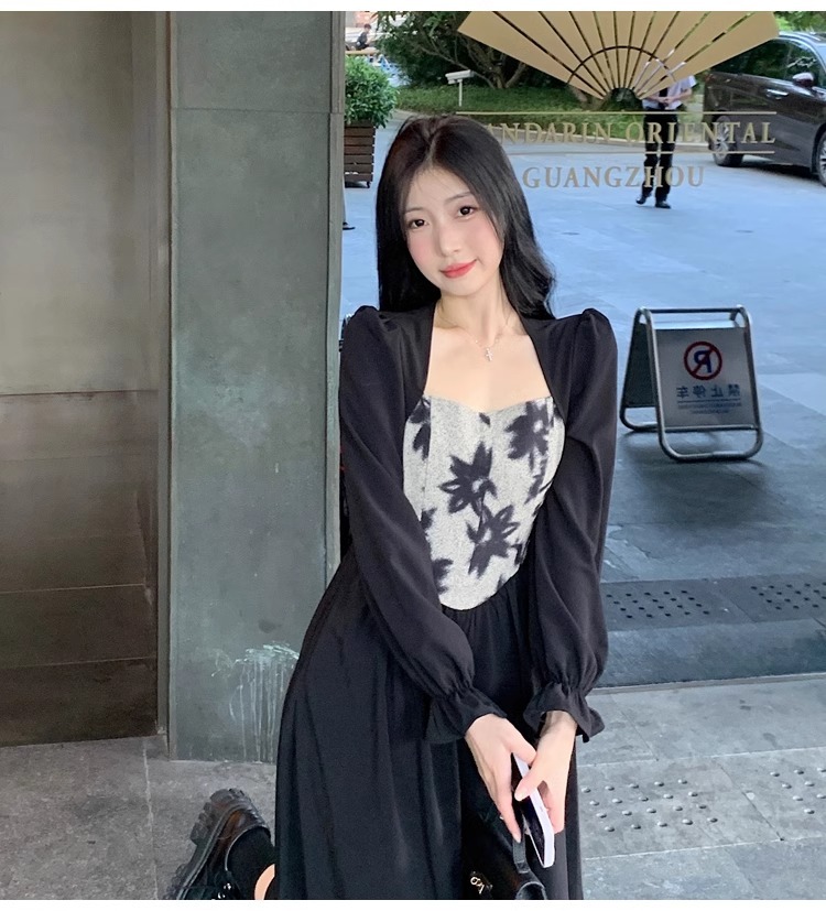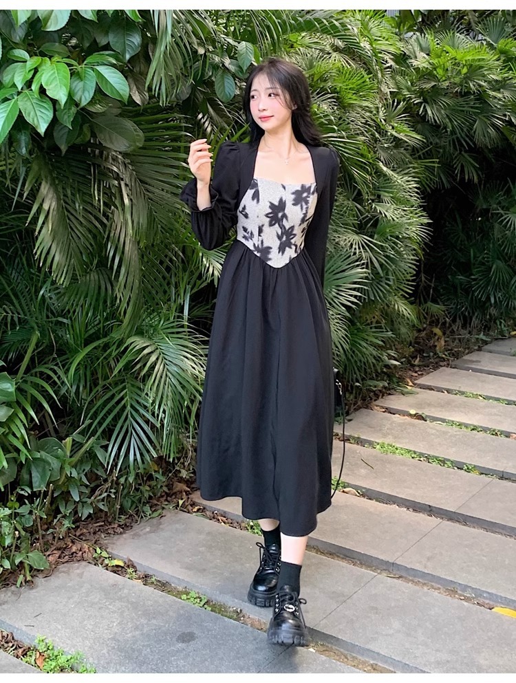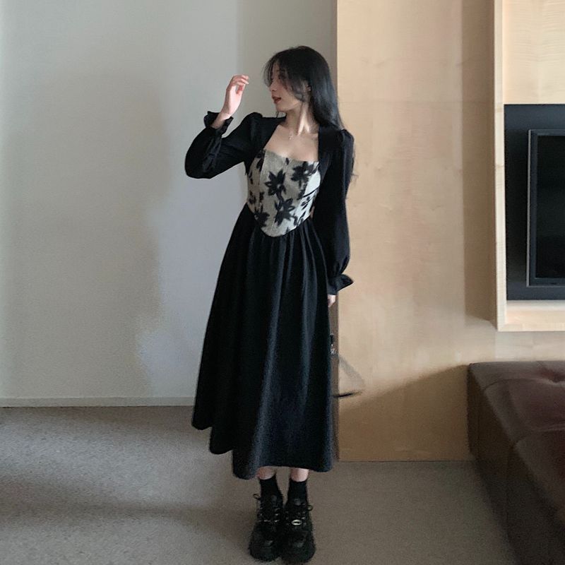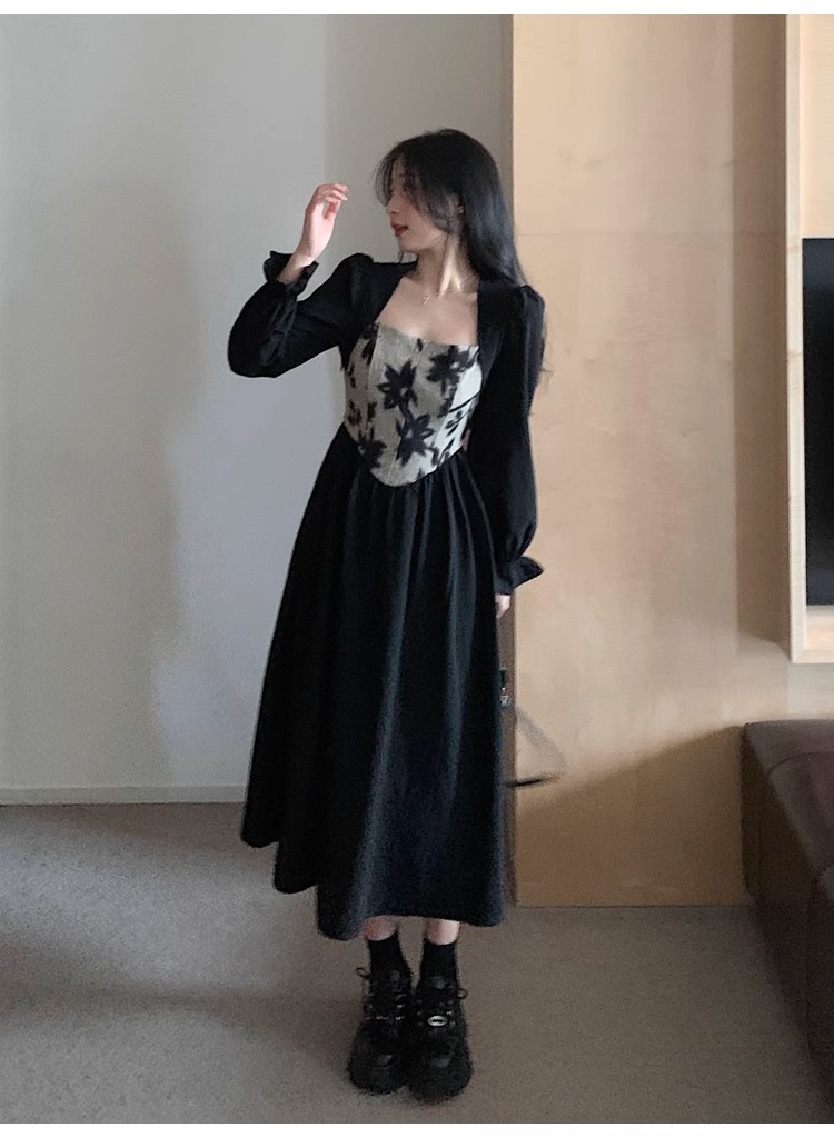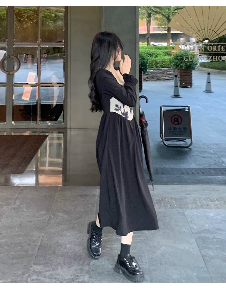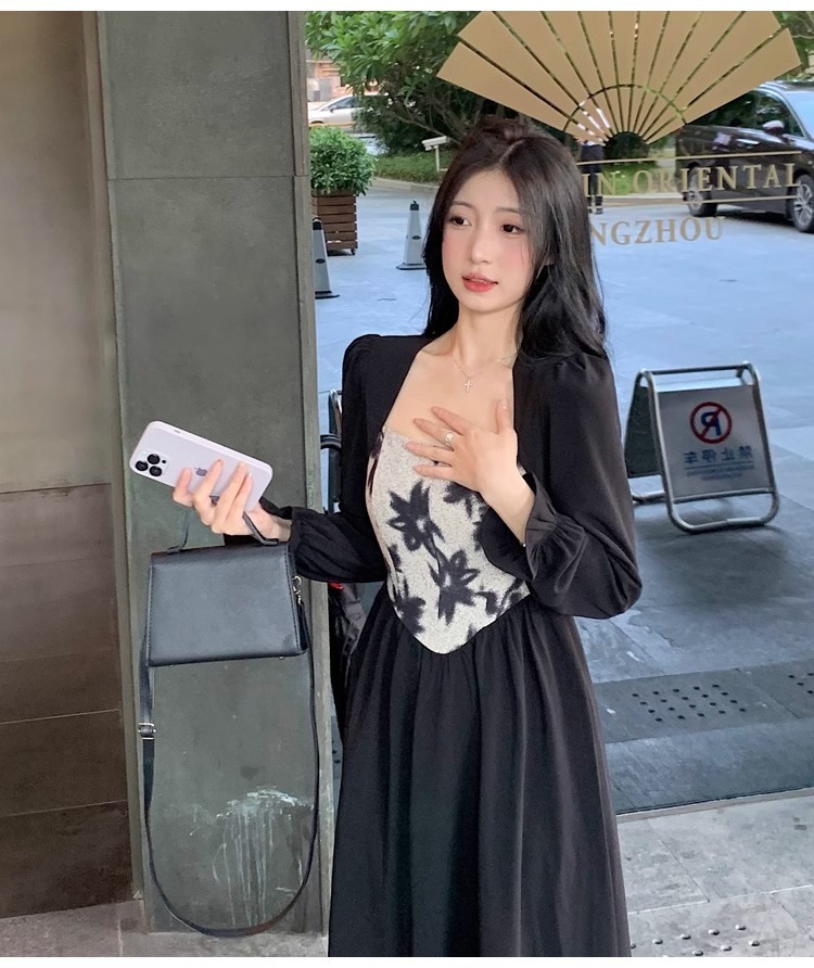 • 大码胖MM法式赫本风黑色方领连衣裙女秋季高级感拼接收腰显瘦裙