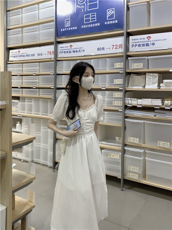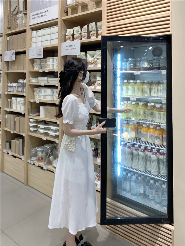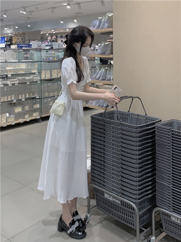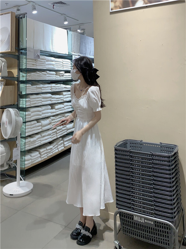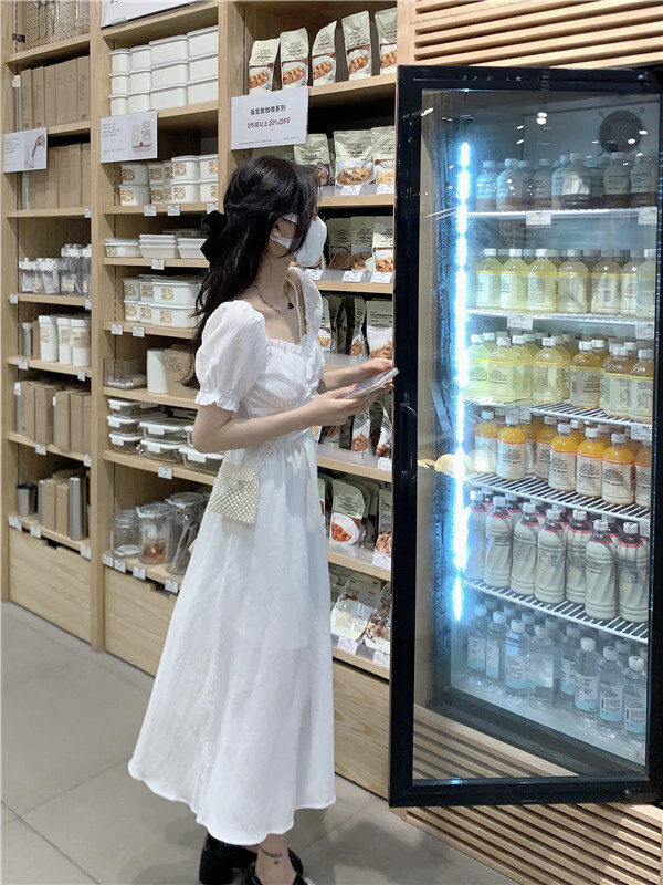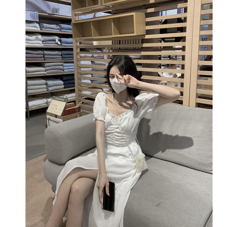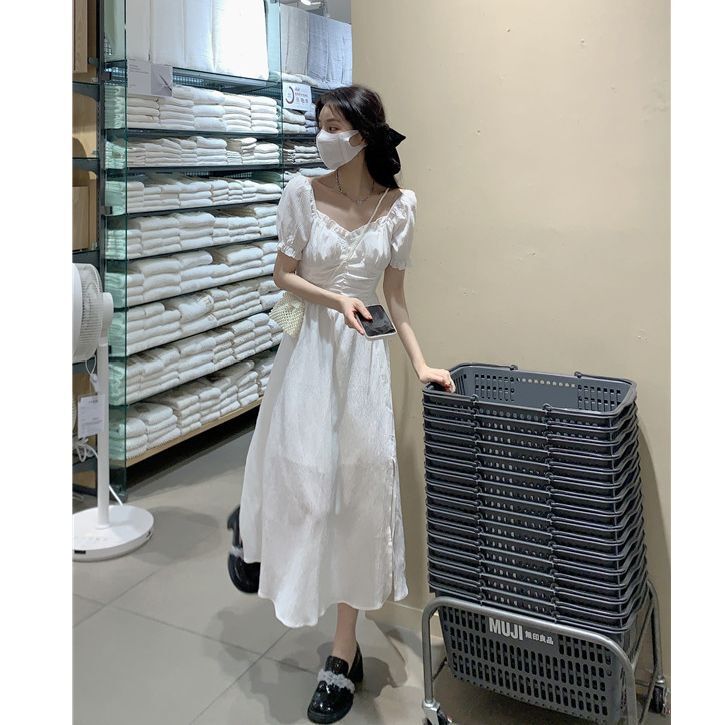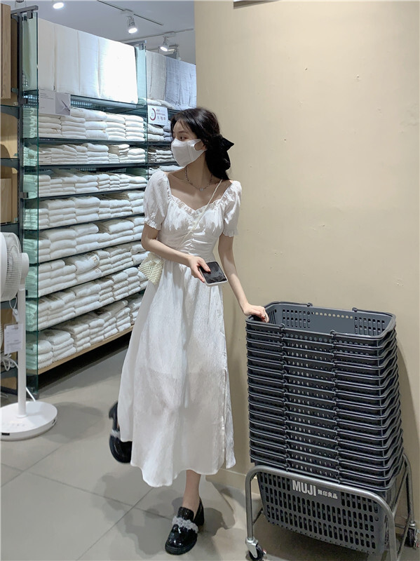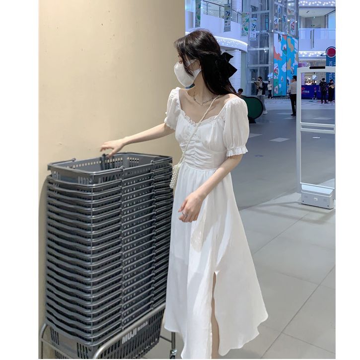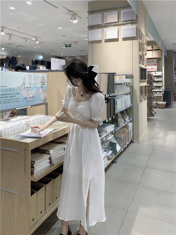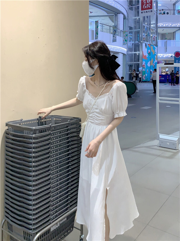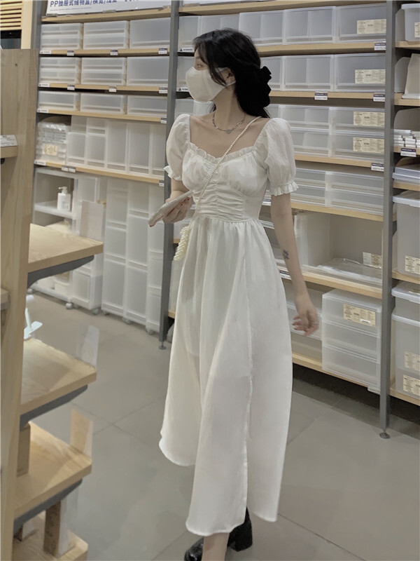 官图 夏季法式气质收腰雪纺显瘦中长款开叉方领短袖连衣裙女
