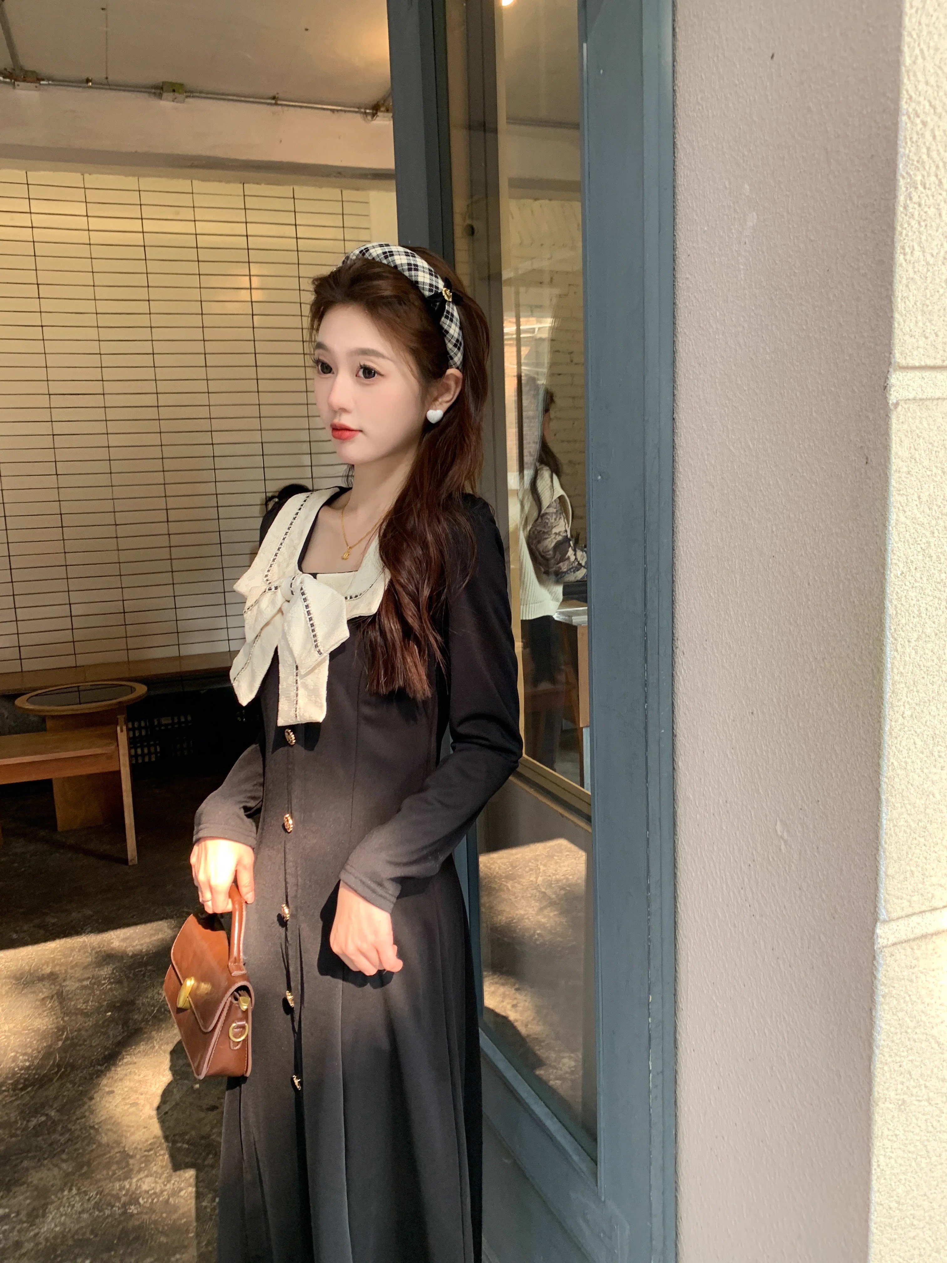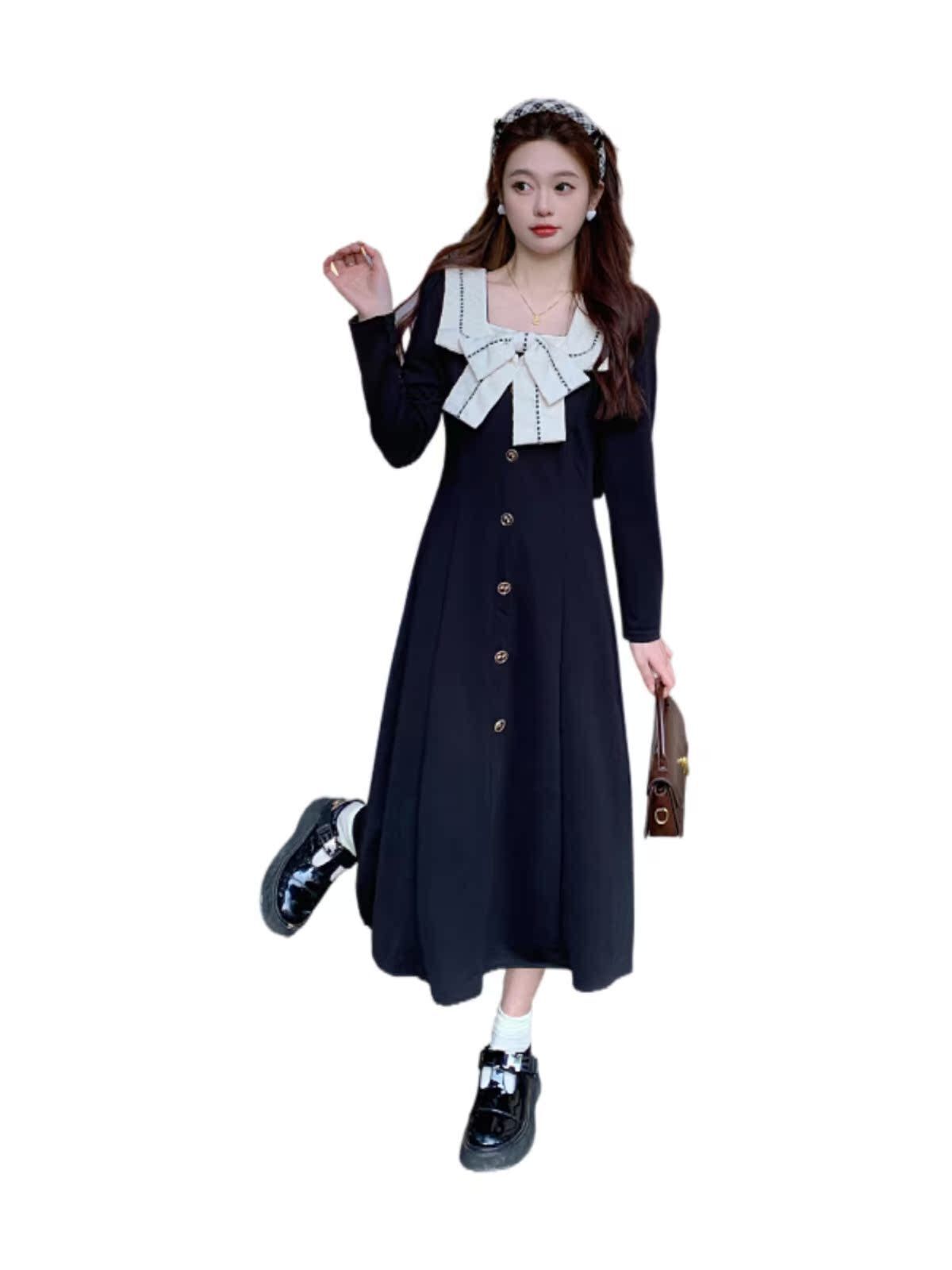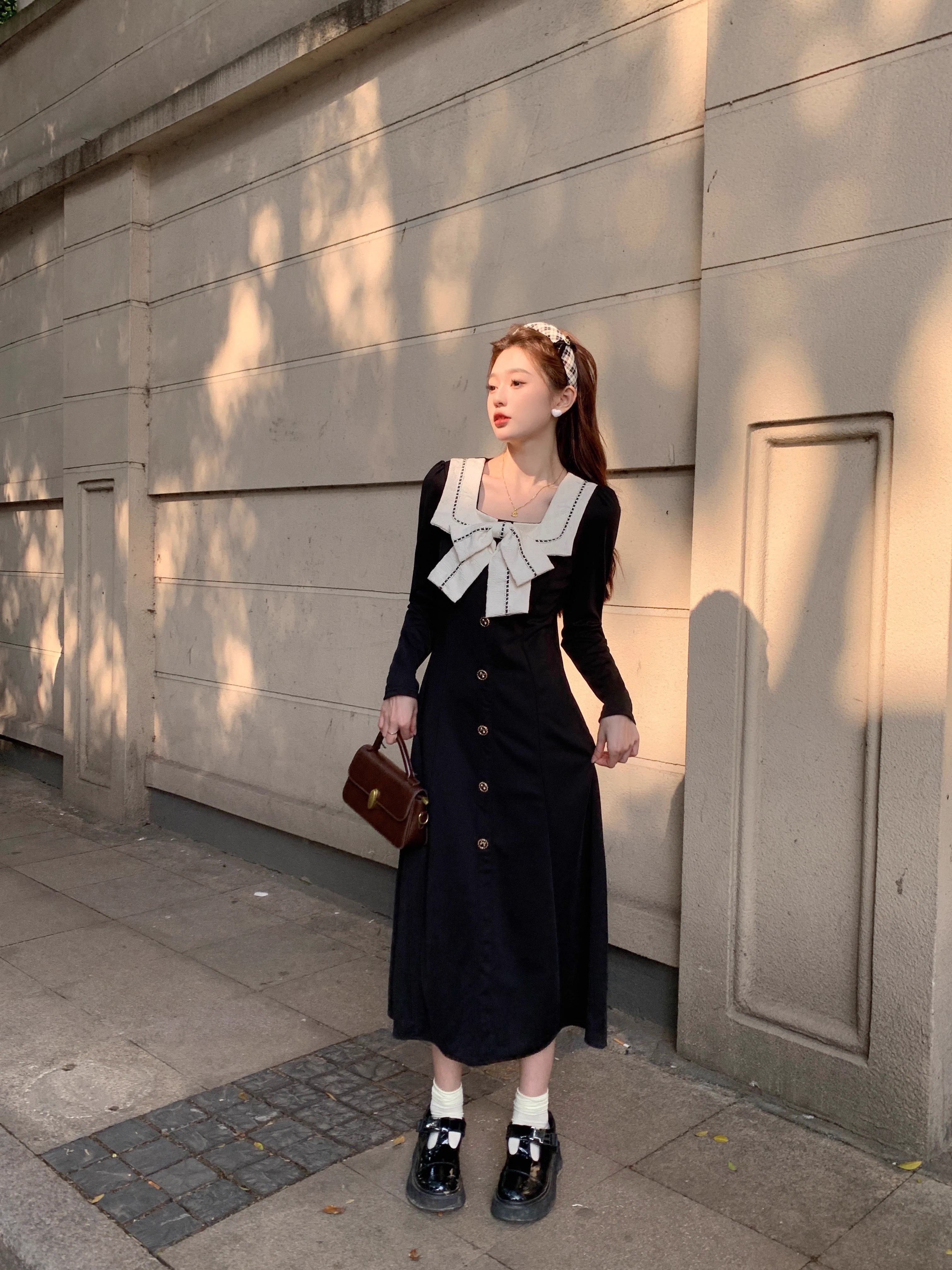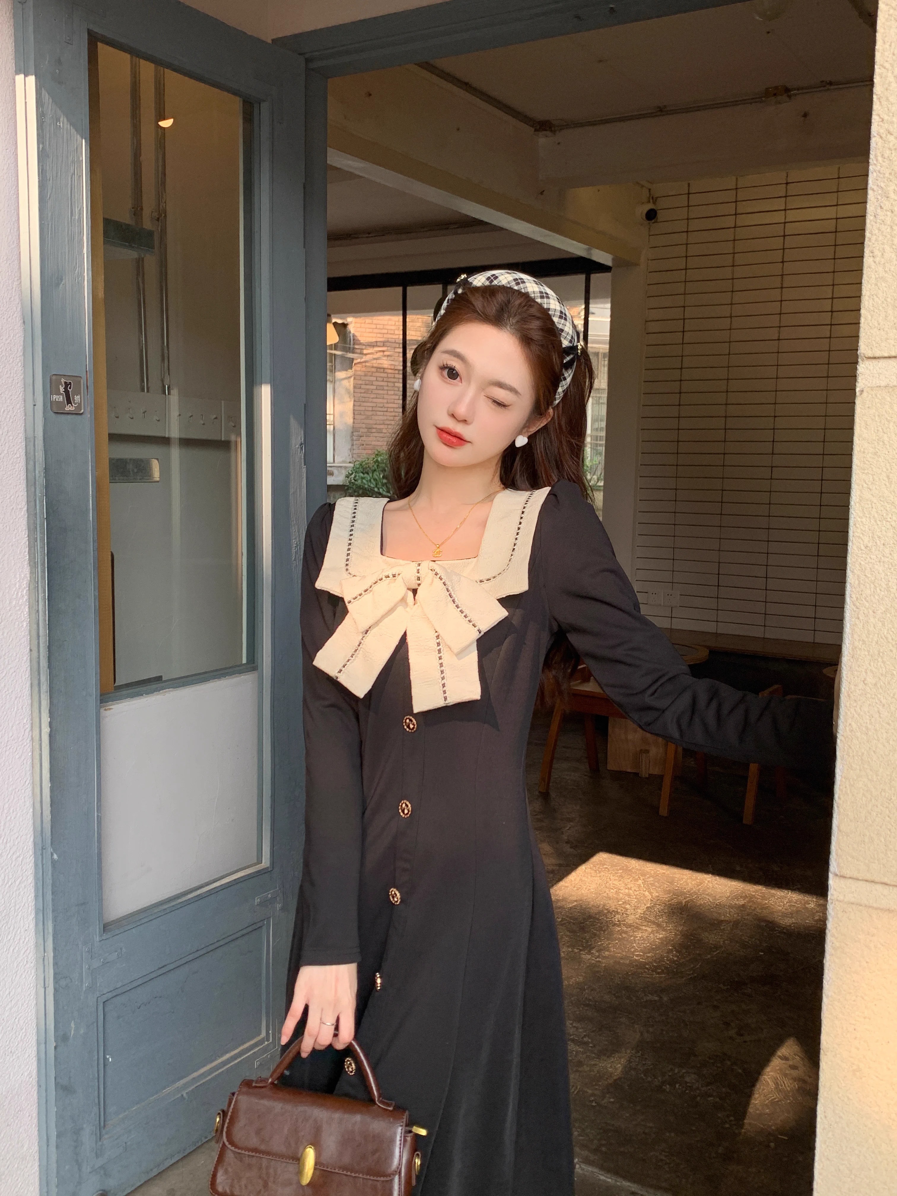 • 2024新款胖mm大码秋季蝴蝶结长裙方领黑色连衣裙女收腰显瘦