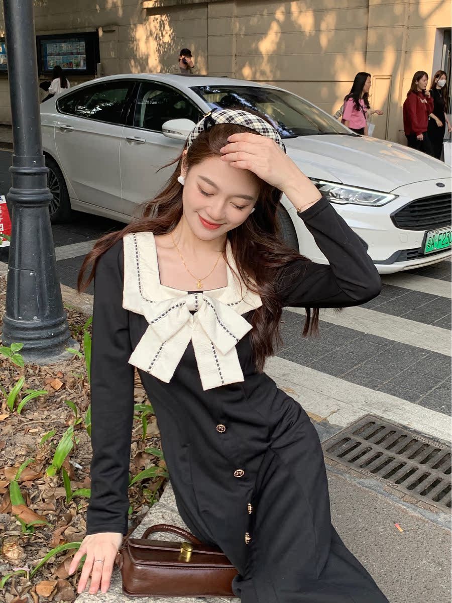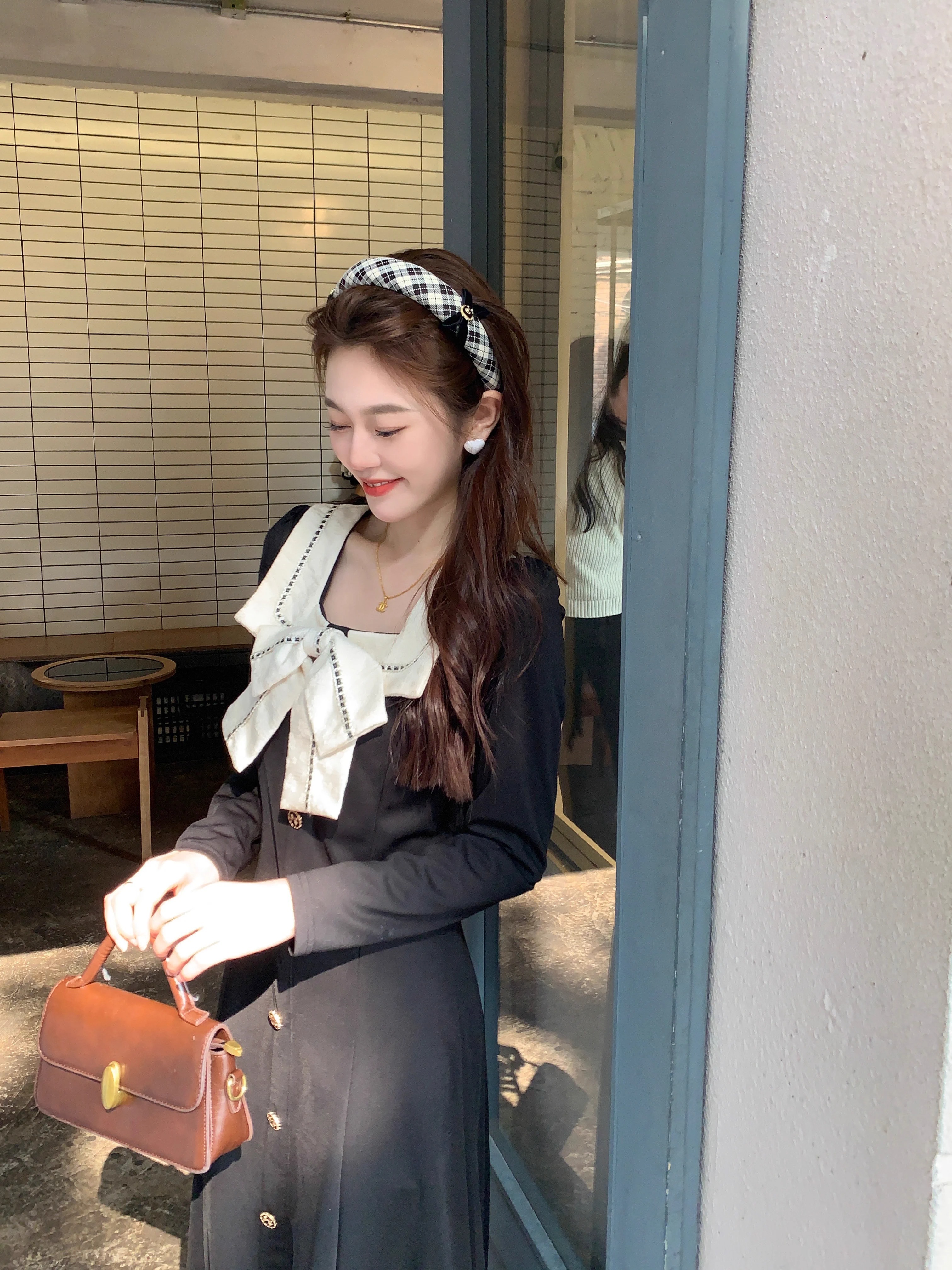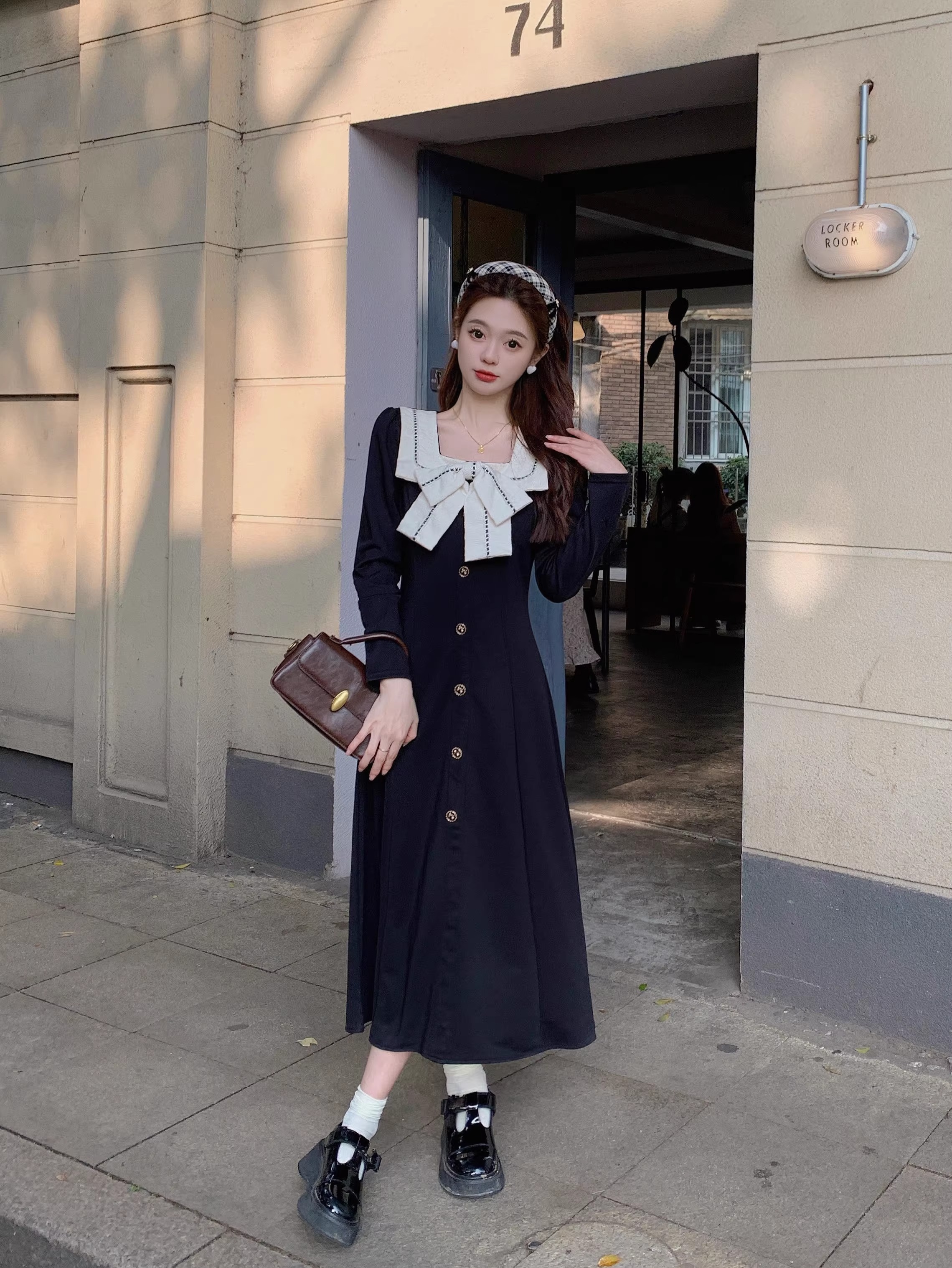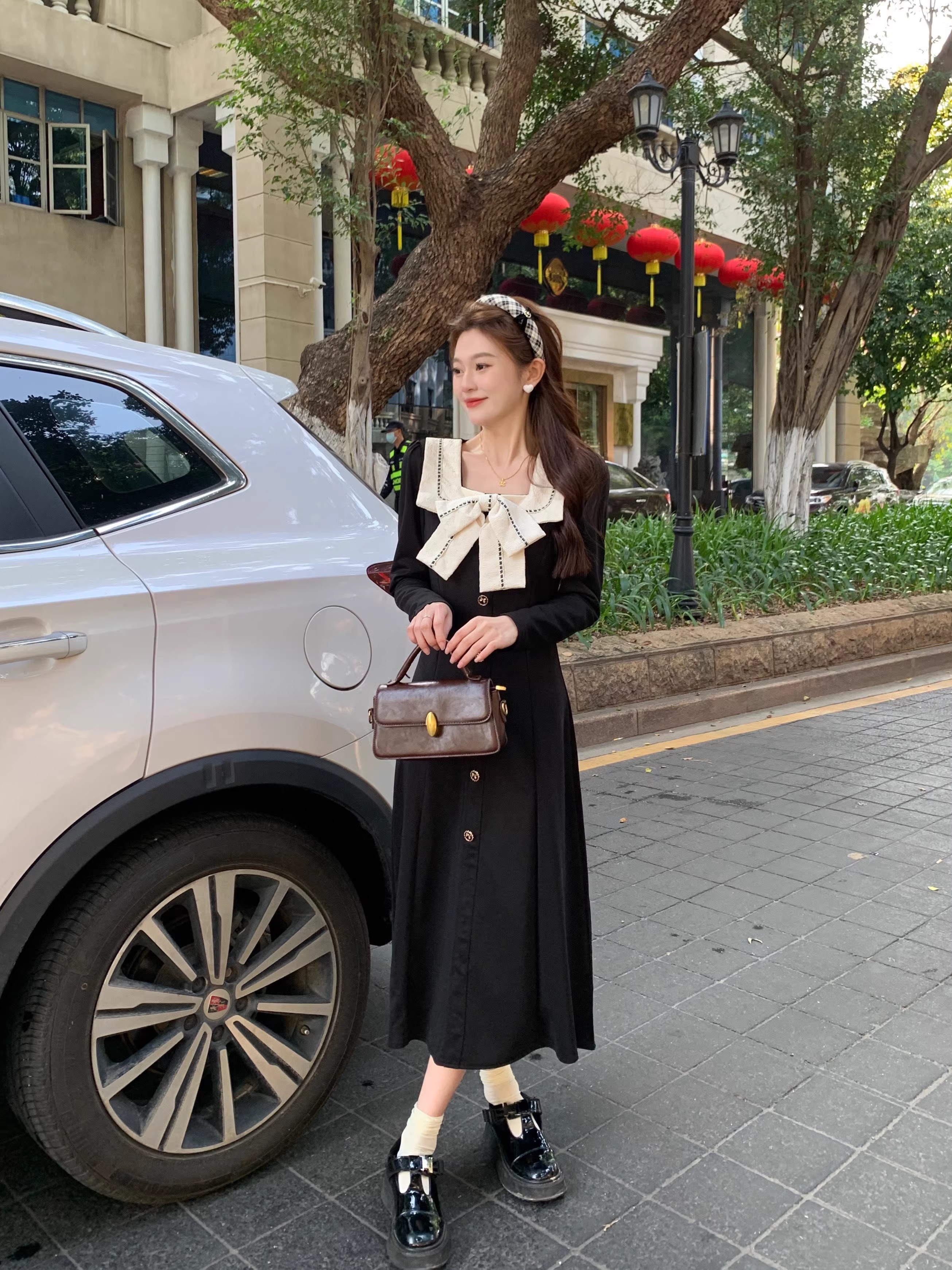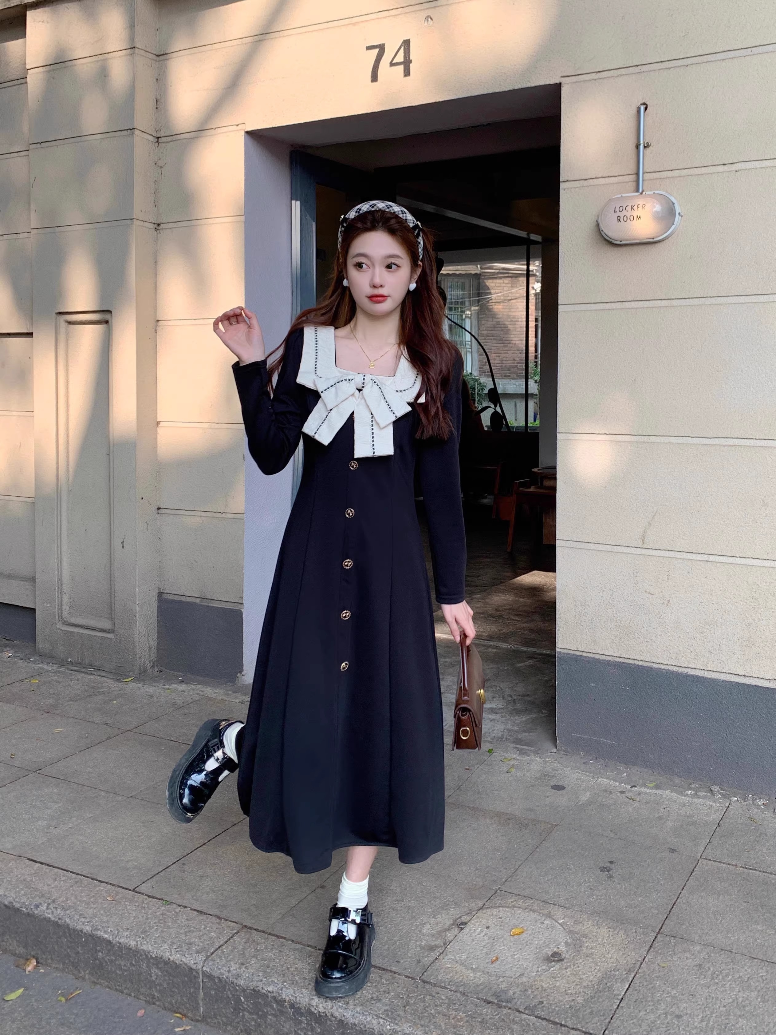 • 2024新款胖mm大码秋季蝴蝶结长裙方领黑色连衣裙女收腰显瘦