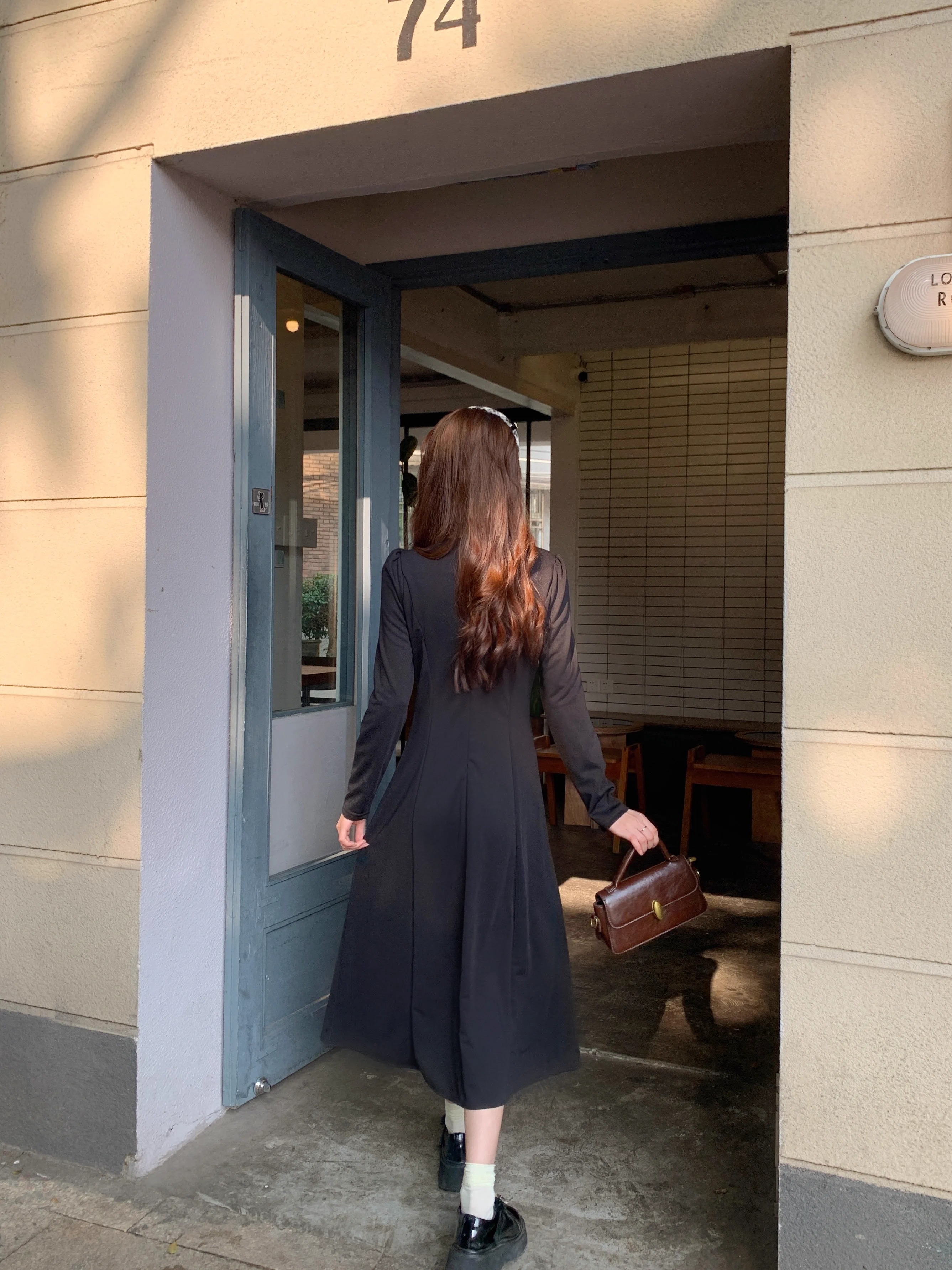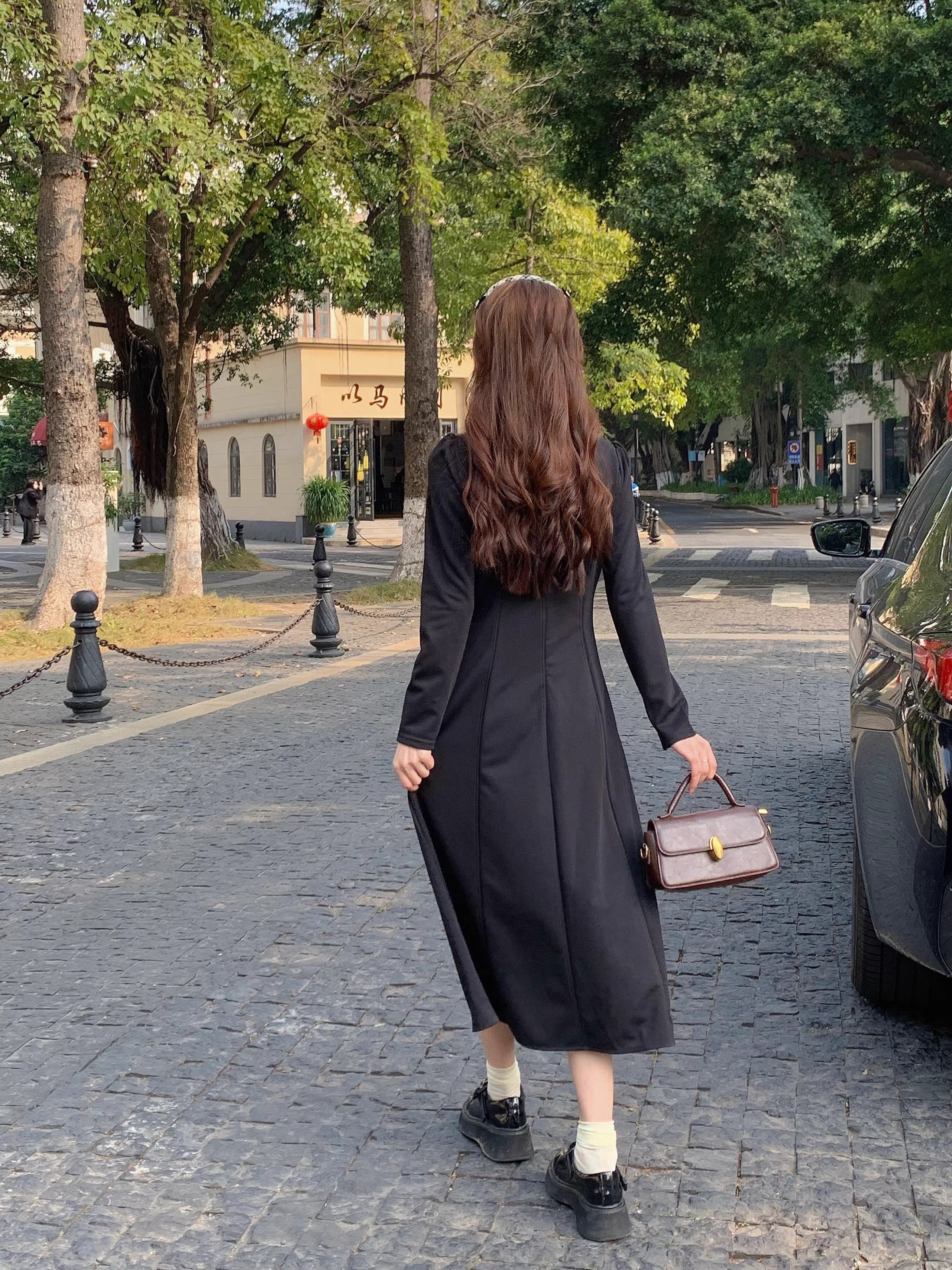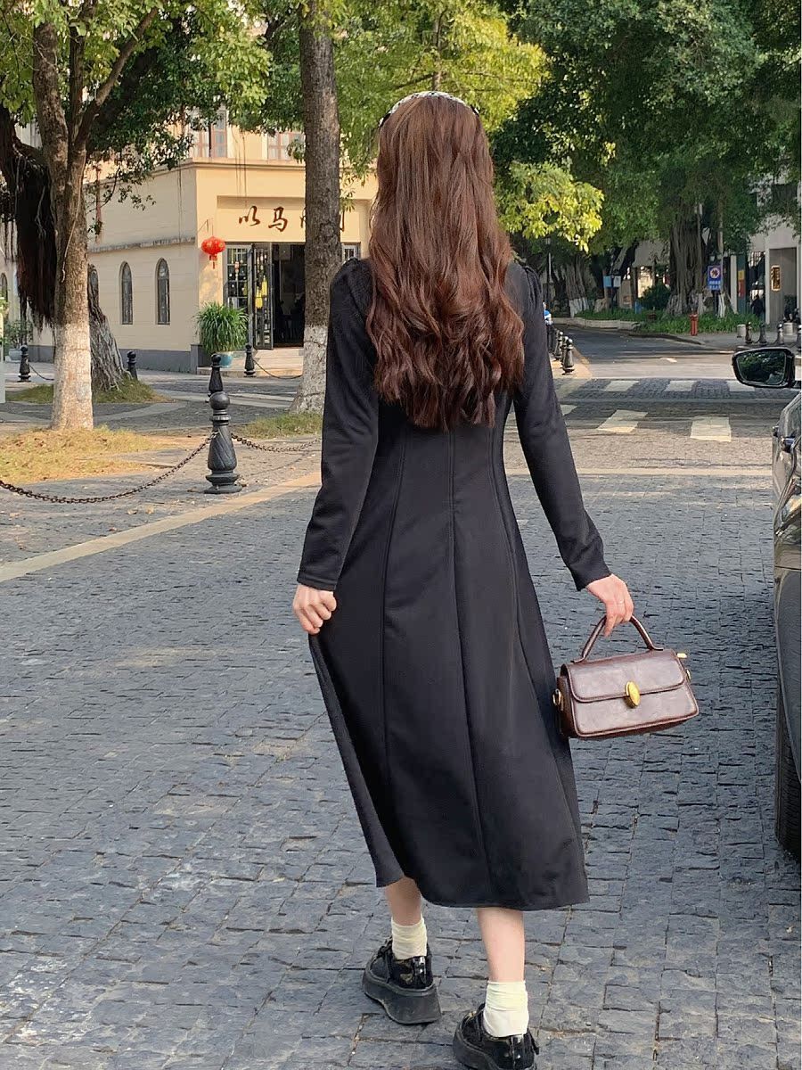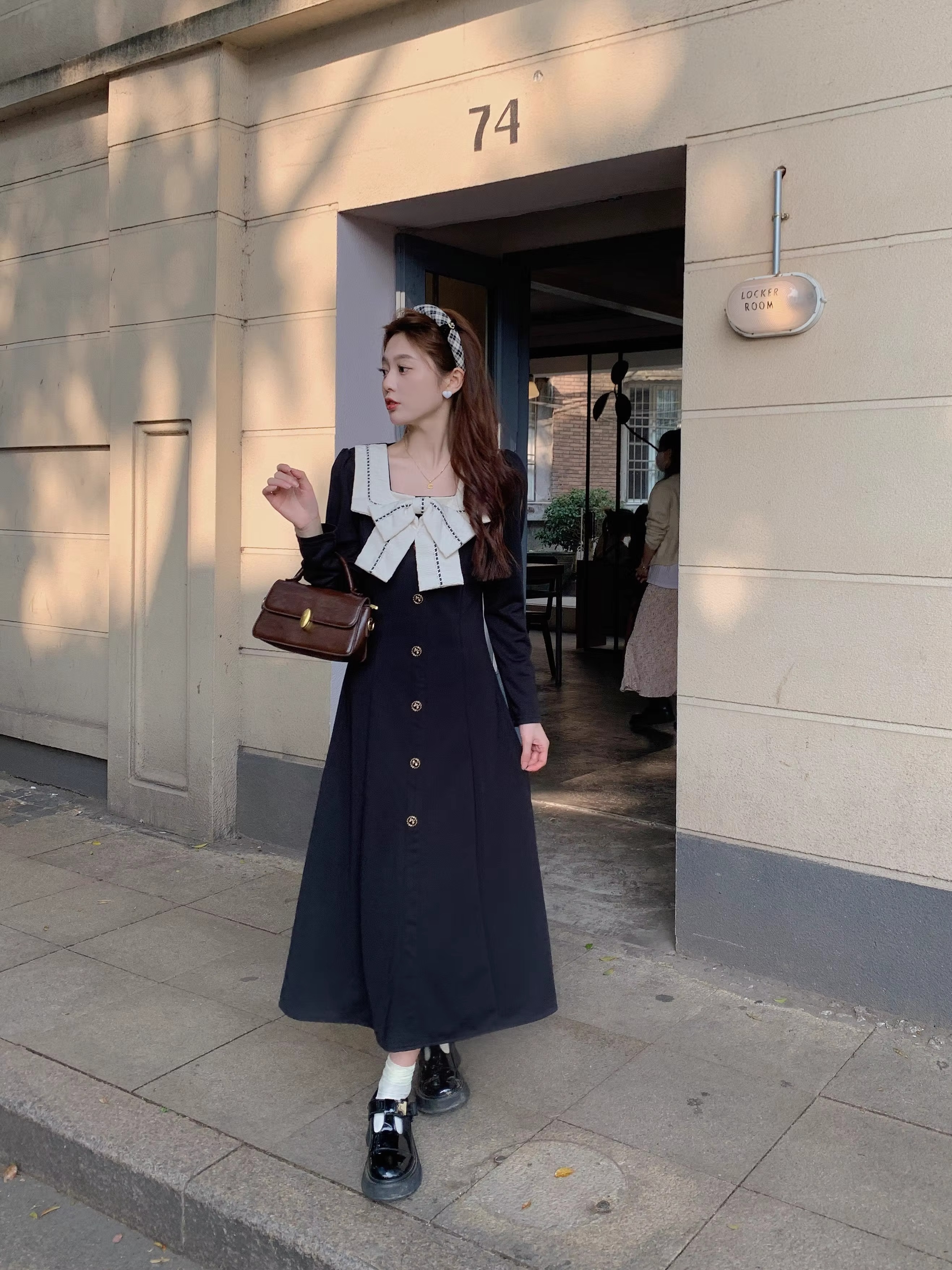 • 2024新款胖mm大码秋季蝴蝶结长裙方领黑色连衣裙女收腰显瘦