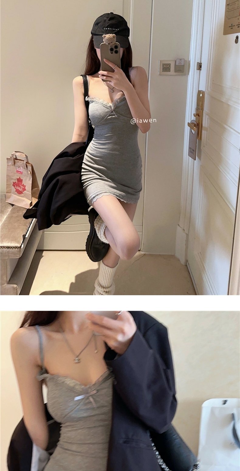 【自带胸垫】蕾丝吊带连衣裙女时髦小姨风性感紧身内搭短裙包臀裙