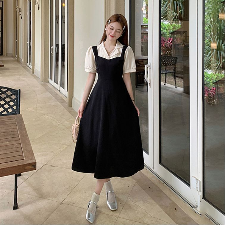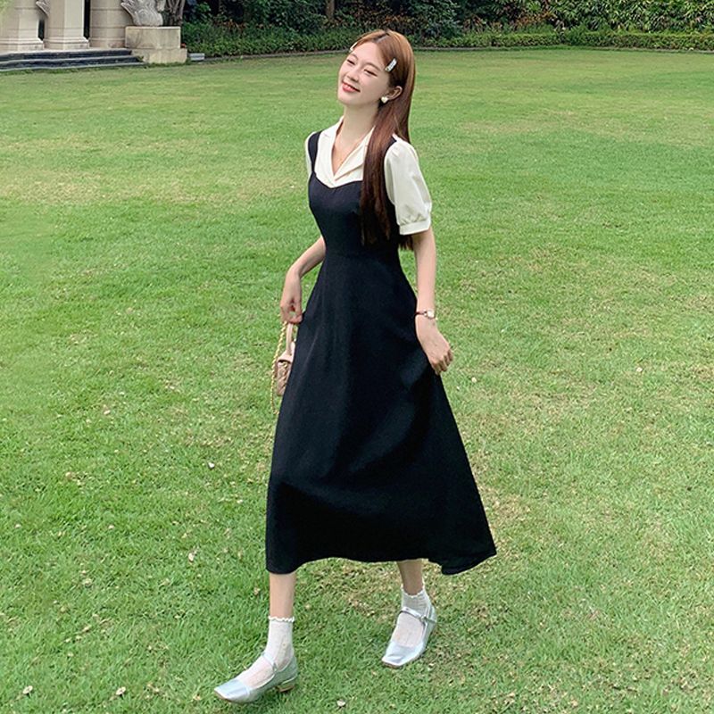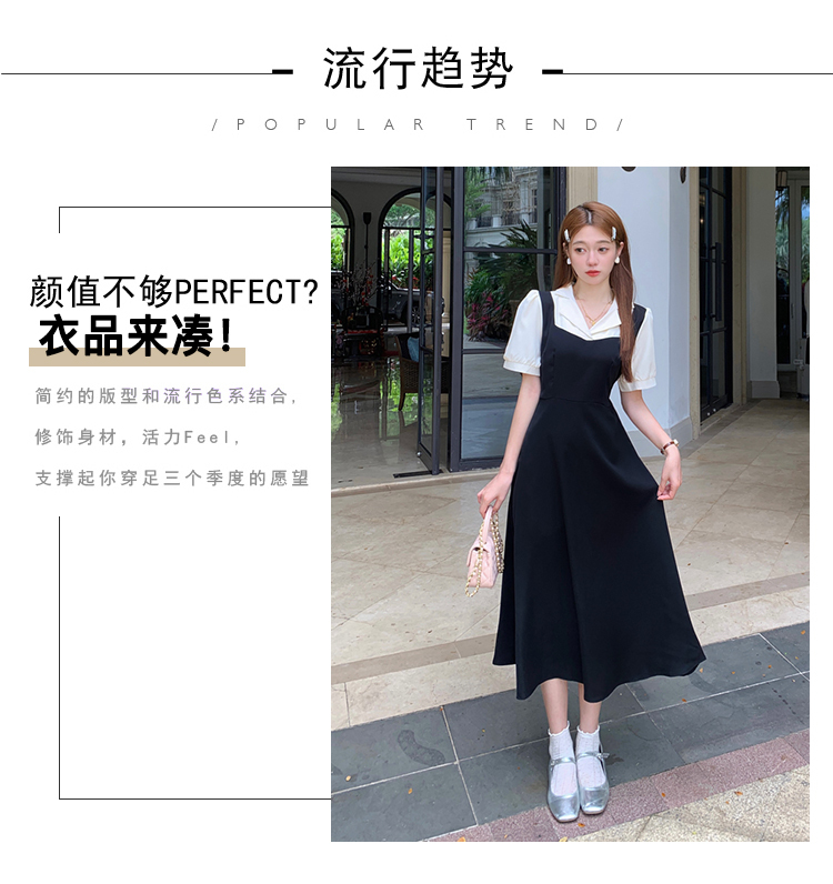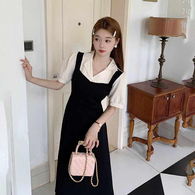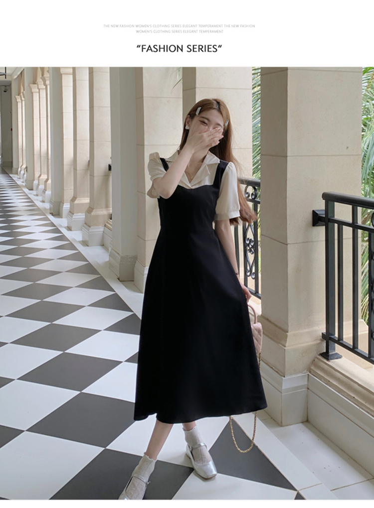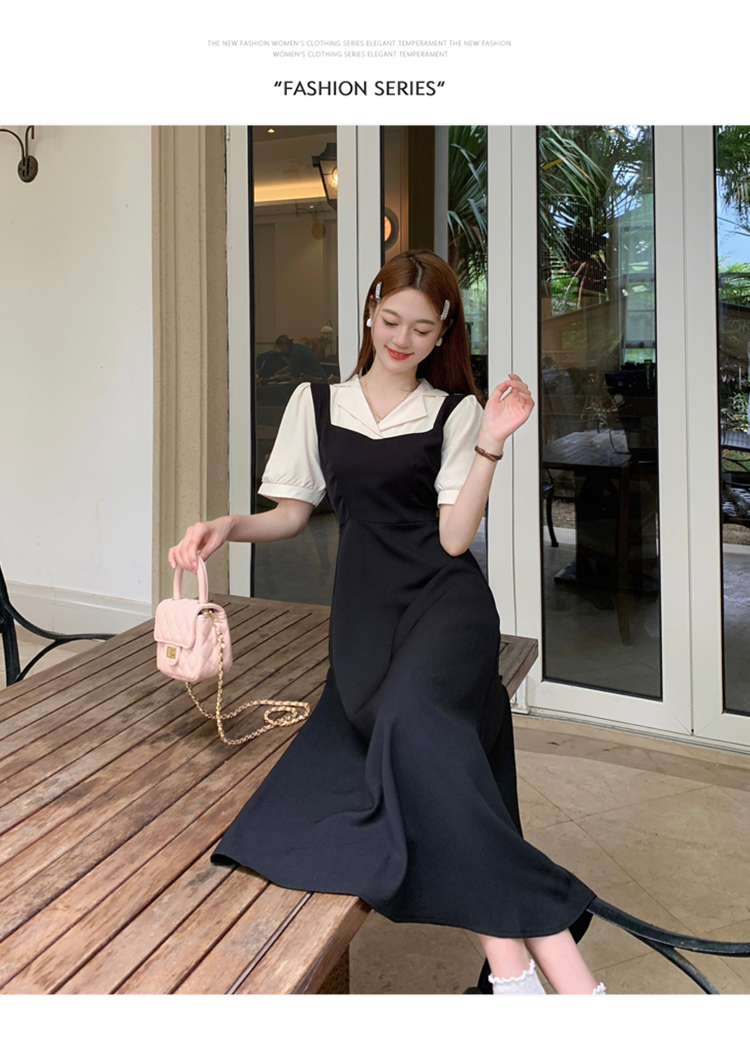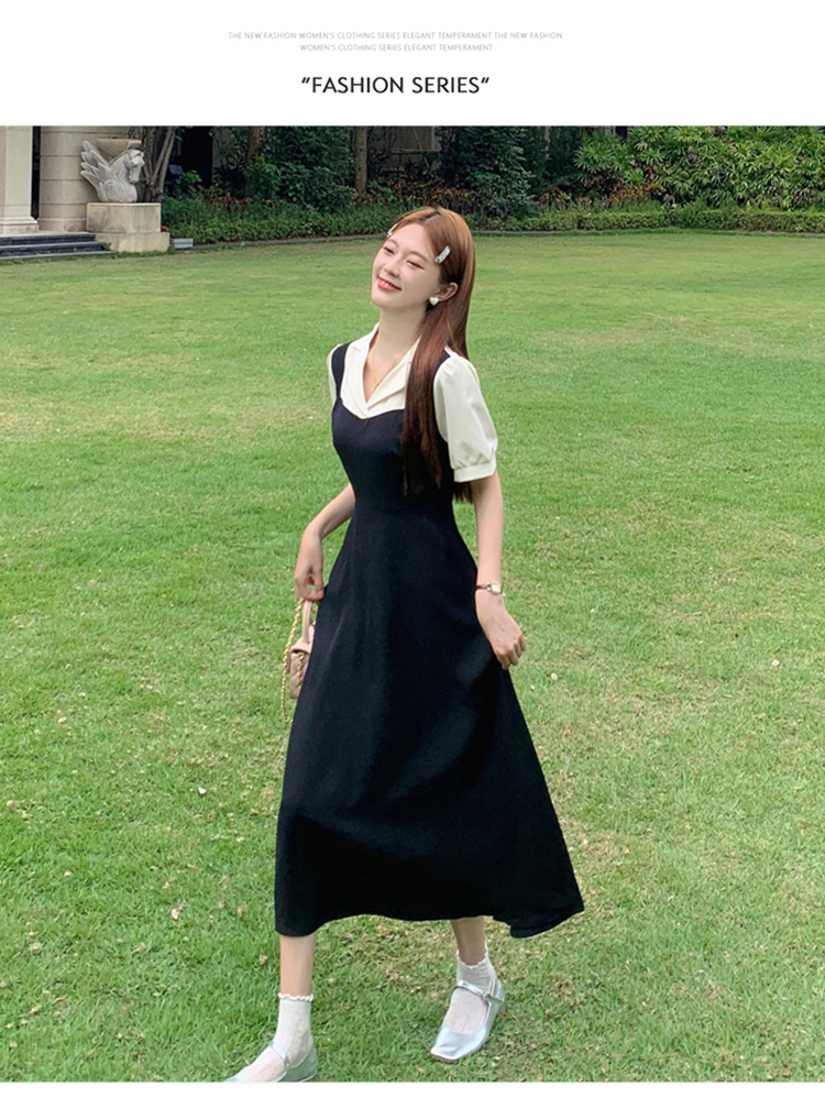 • #825【后包领做工】实拍实价新款撞色拼接假两件收腰系带A字