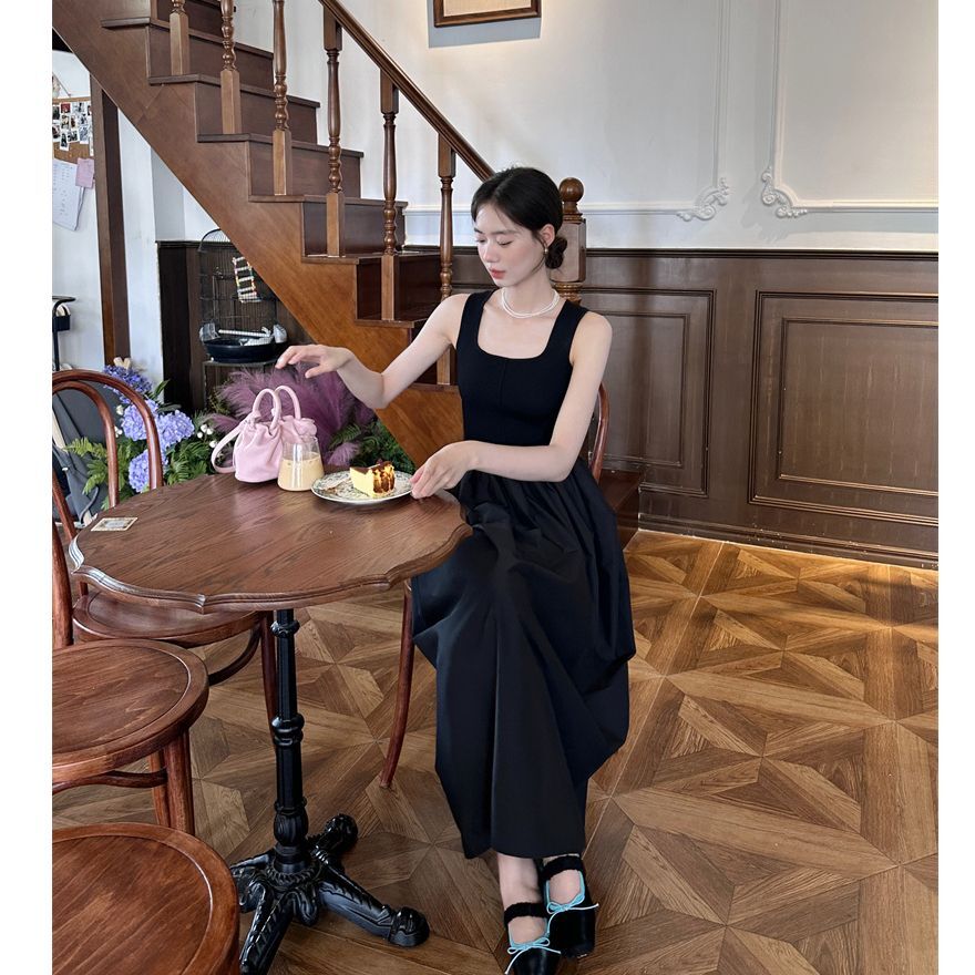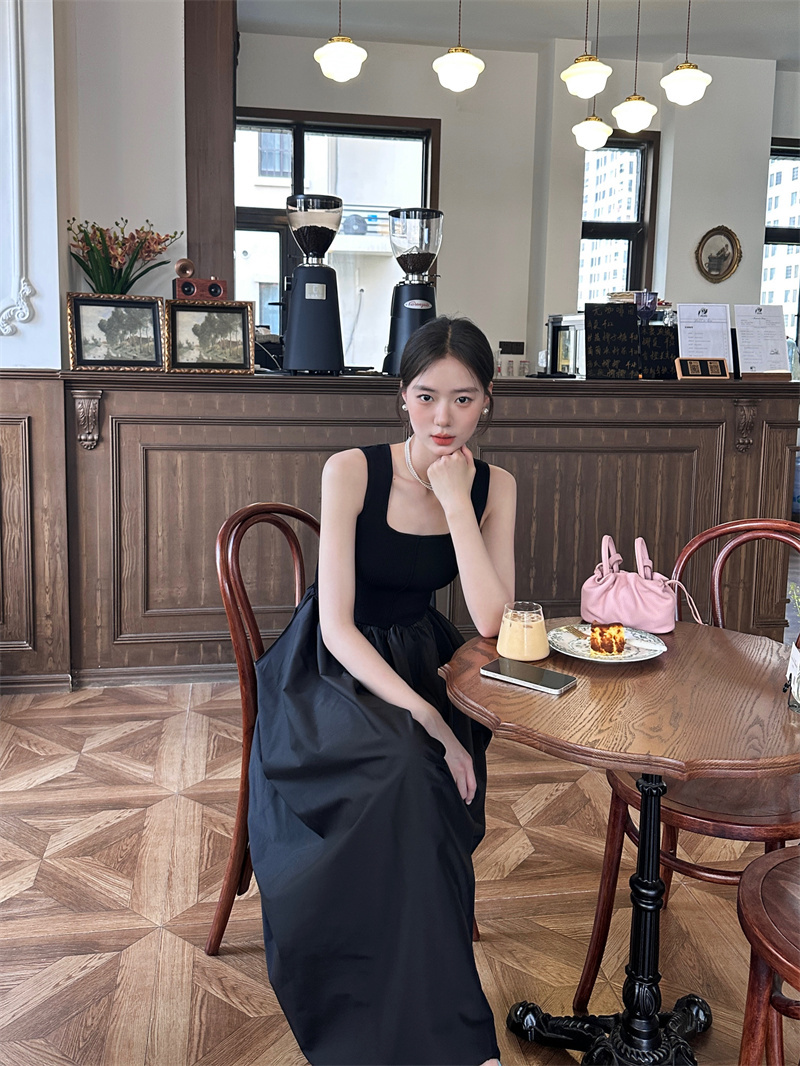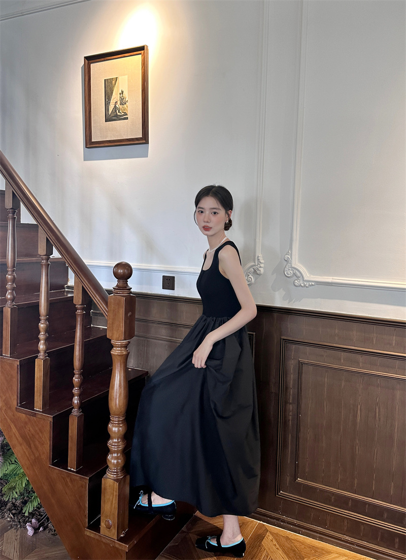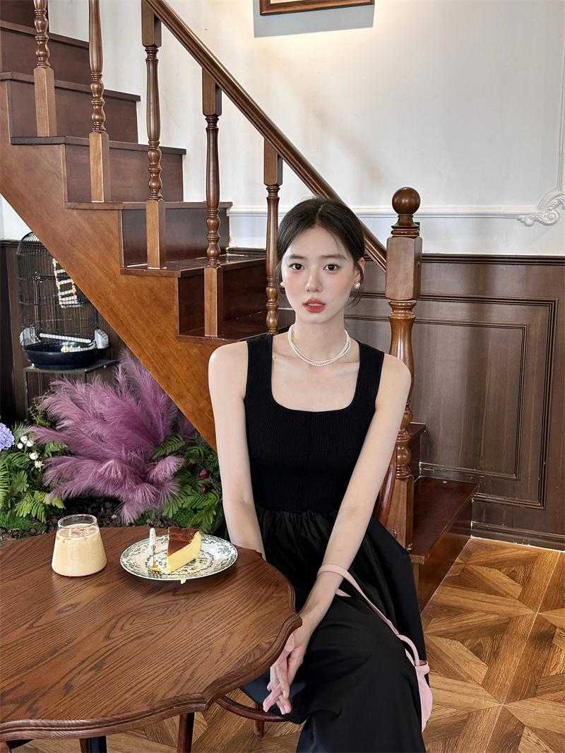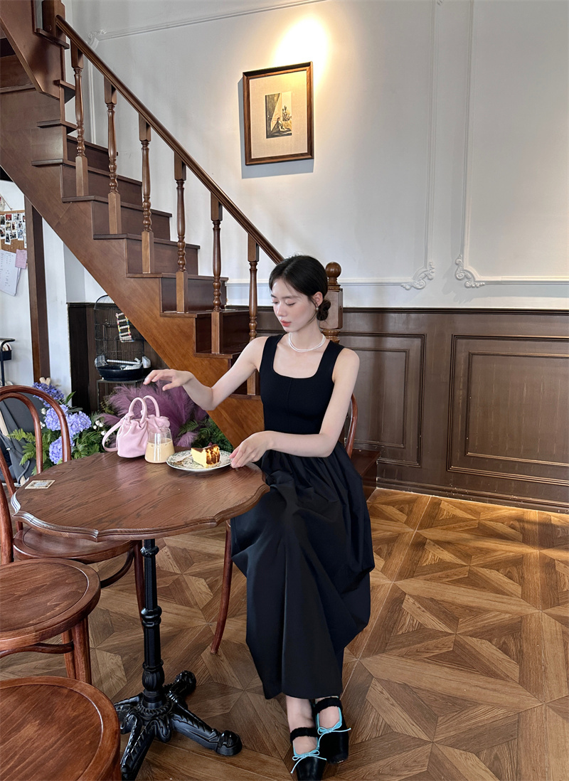 - 复古海边度假风格子连衣裙简约气质背心裙