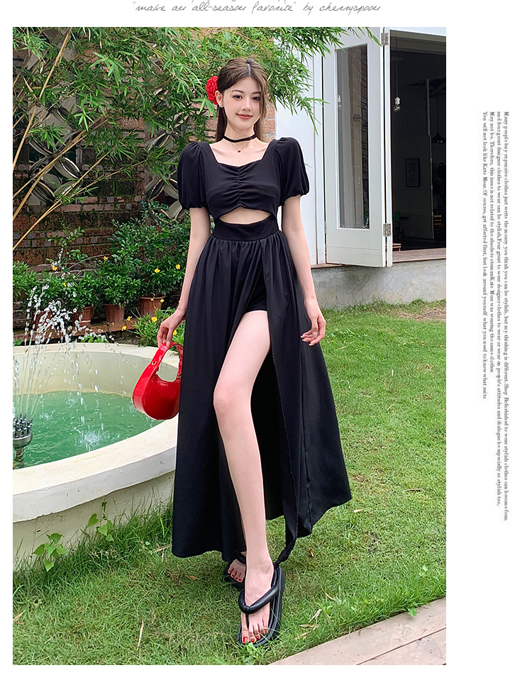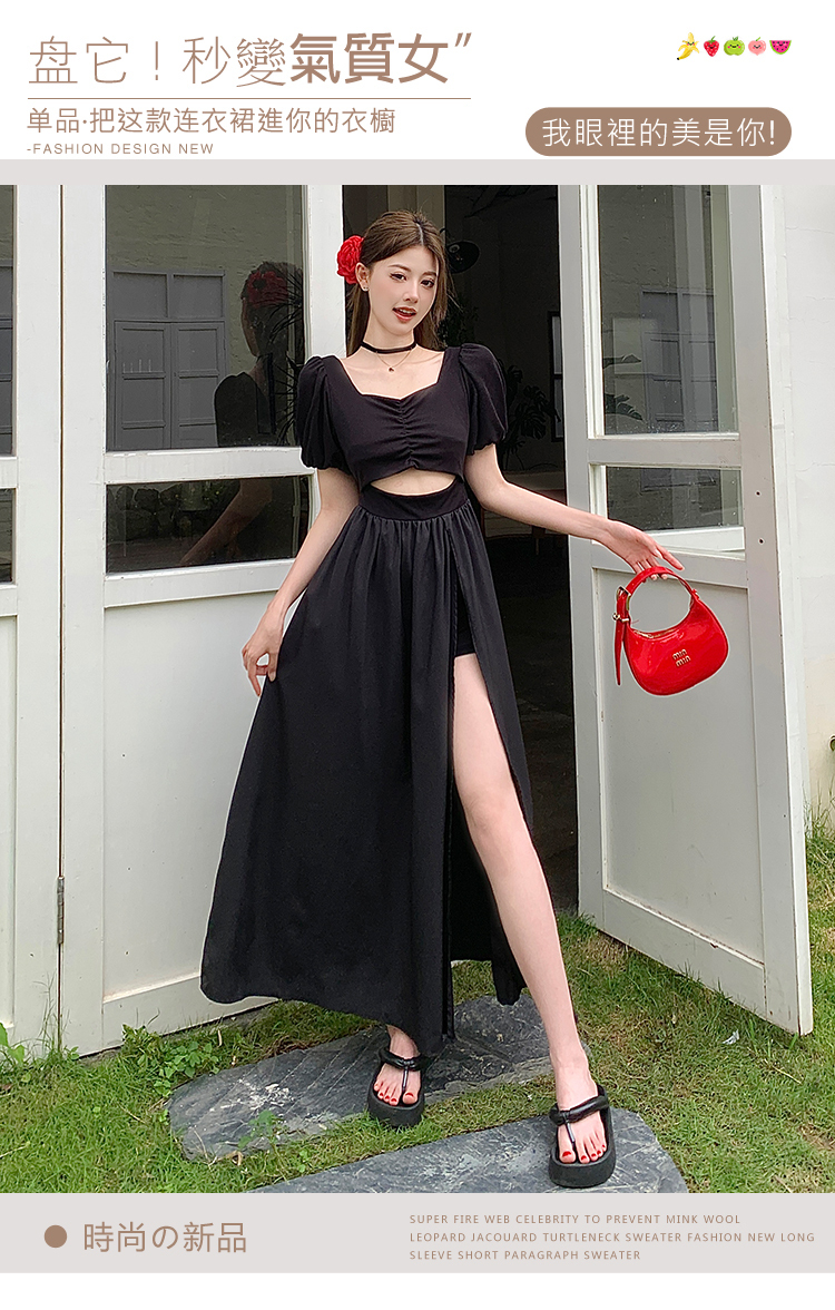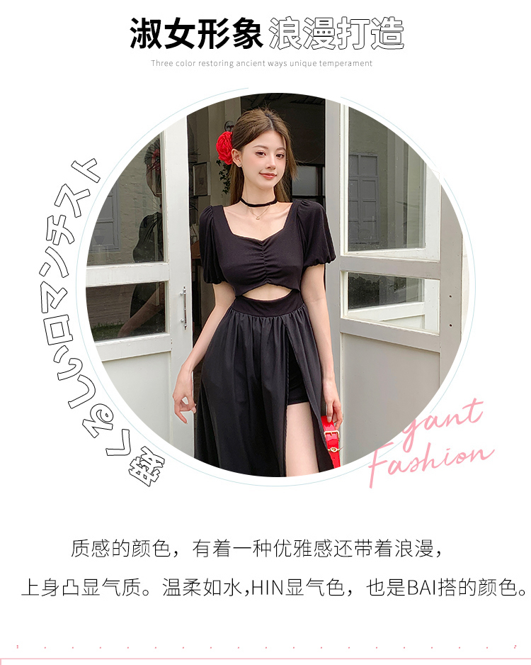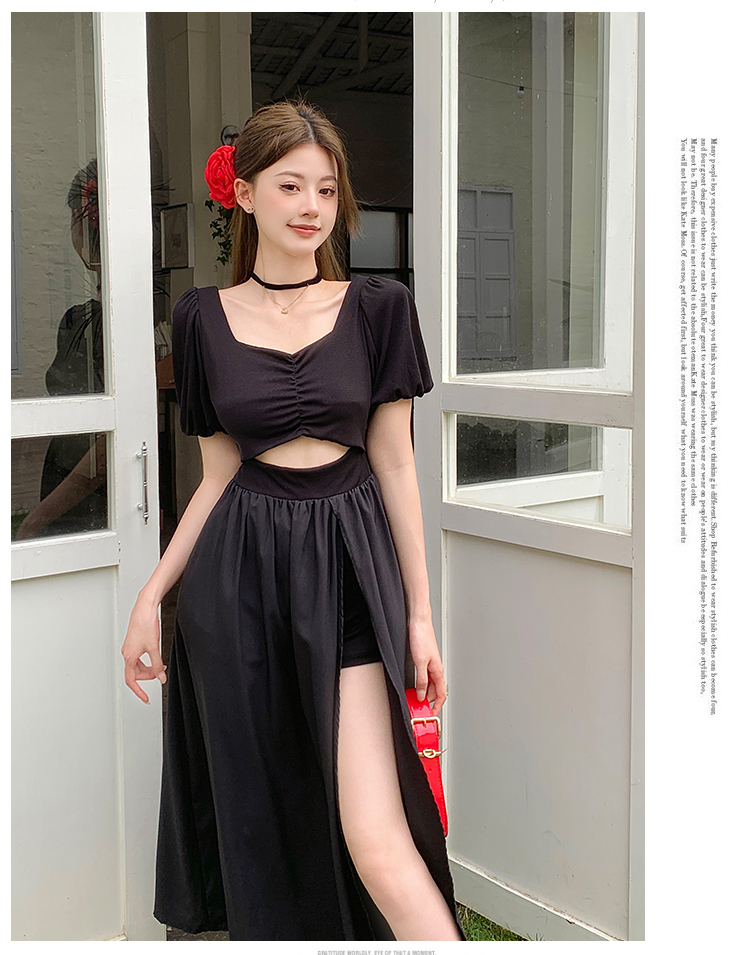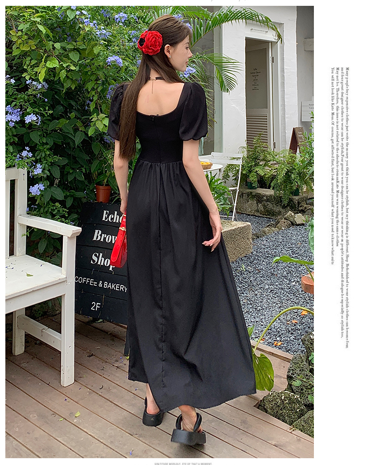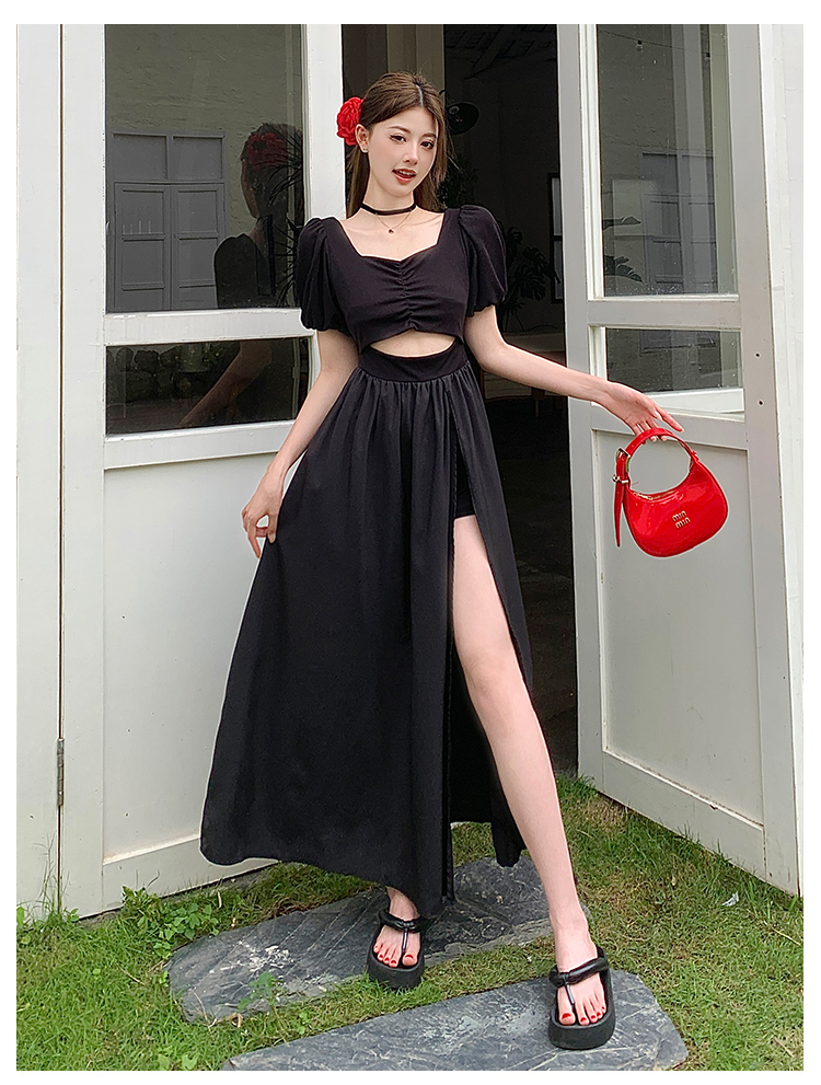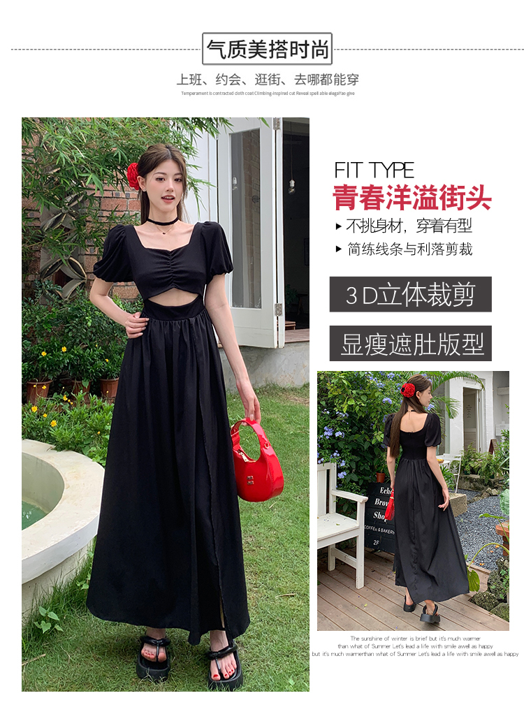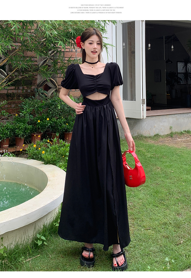 • 实拍现货黑色方领镂空泡泡短袖连衣裙女夏季小众设计开叉显瘦长裙