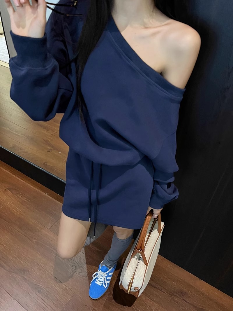 露思同款美式斜肩卫衣女秋季2024新款松弛感慵懒宽松露肩长袖