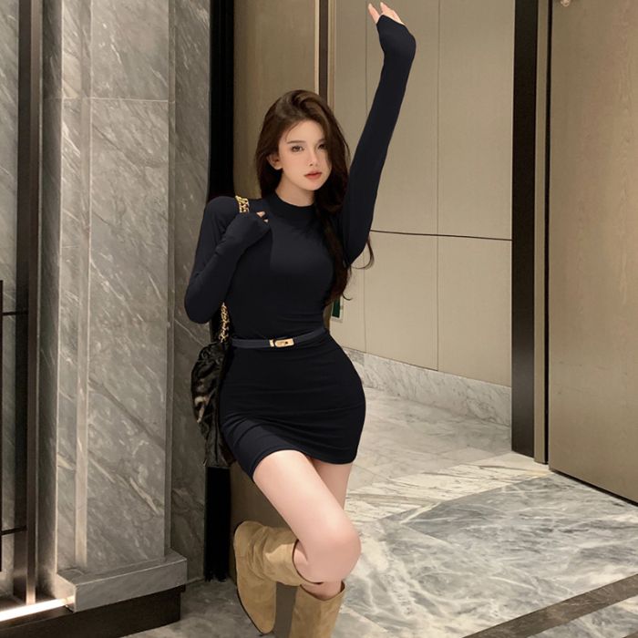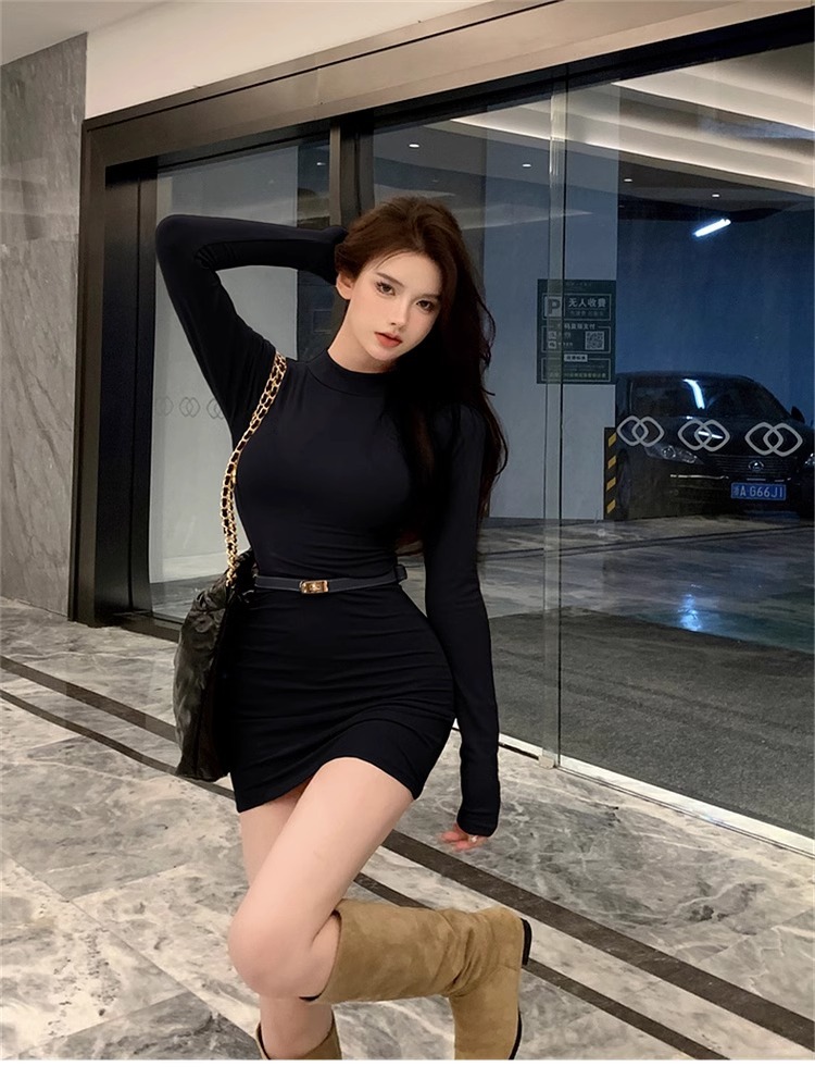 • 黑色半高领针织连衣裙女长袖2025年秋冬季新款显瘦内搭打底包